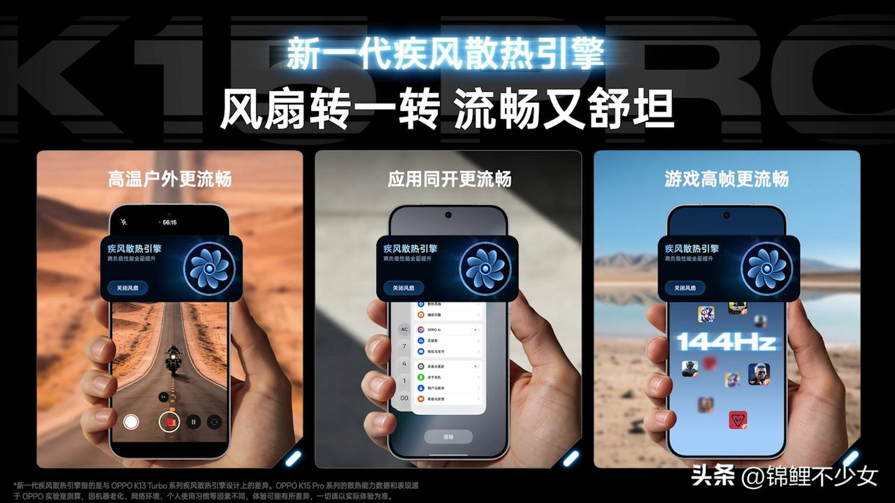 风扇转一转,流畅又舒坦,K15 Pro 搭载的新一代疾风散热引擎,点开风扇开关,不止游戏玩得爽,生活处处玩得转。有效解决高温户外录像易中断、游戏与视频通话同开时过热掉帧等痛点,支持多款主流游戏原生144帧畅玩,真正实现了“不止游戏能用,日常生活更好用”的全方位流畅体验。