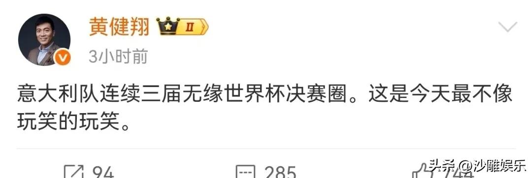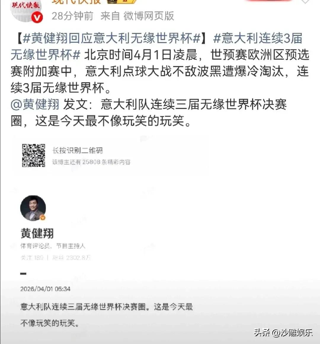 今天是4月1日愚人节,清晨5点43分,当大多数人还在睡梦中,体育评论员黄健翔突然在社交平台发文,字里行间全是遗憾和无奈:“意大利队连续三届无缘世界杯决赛圈,这是今天最不像玩笑的玩笑。”