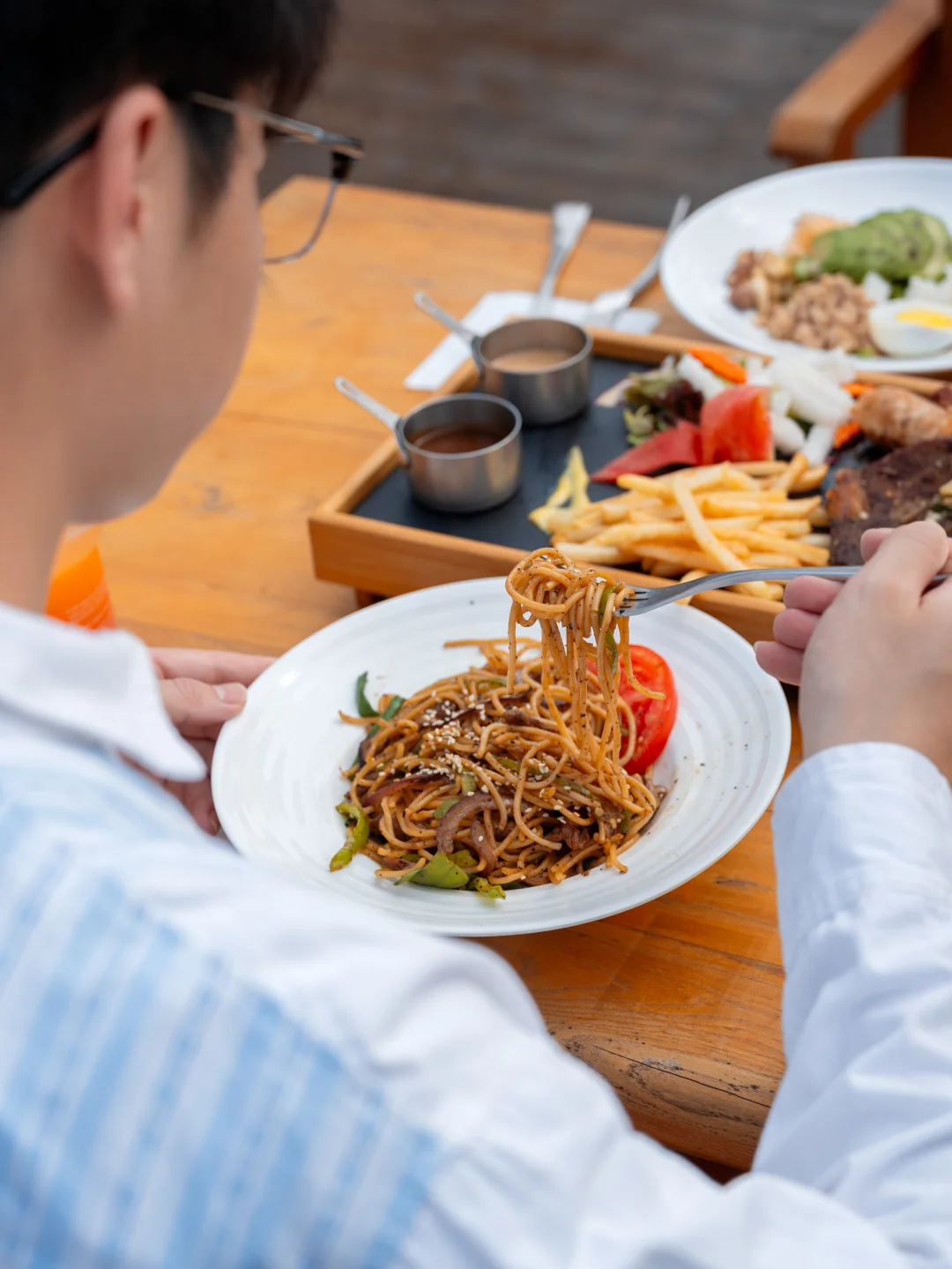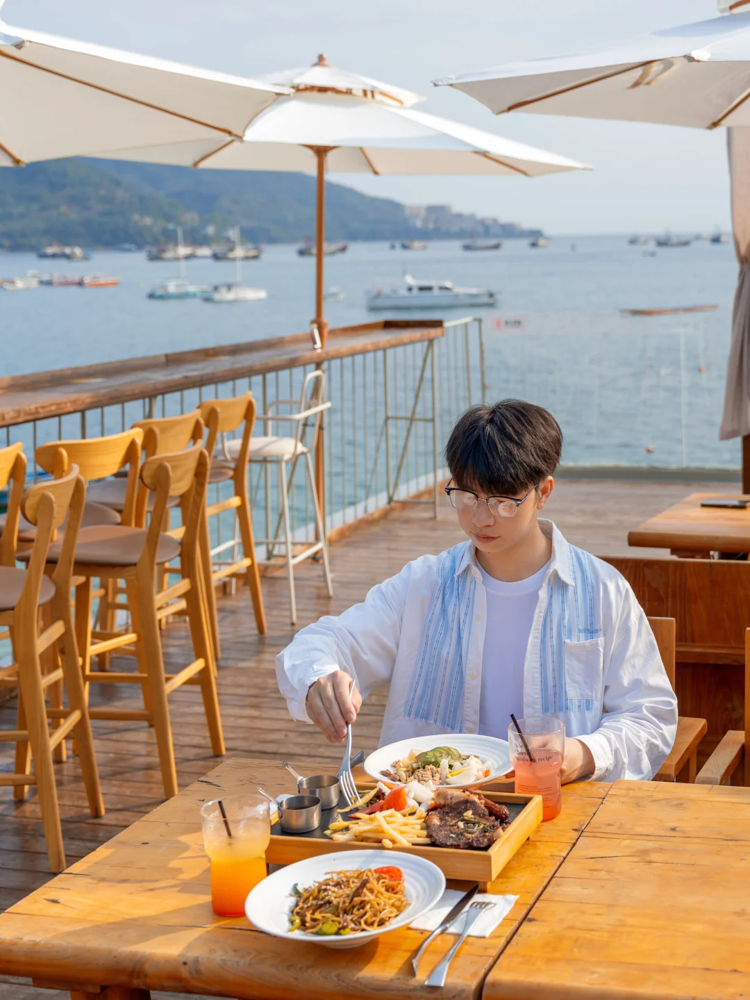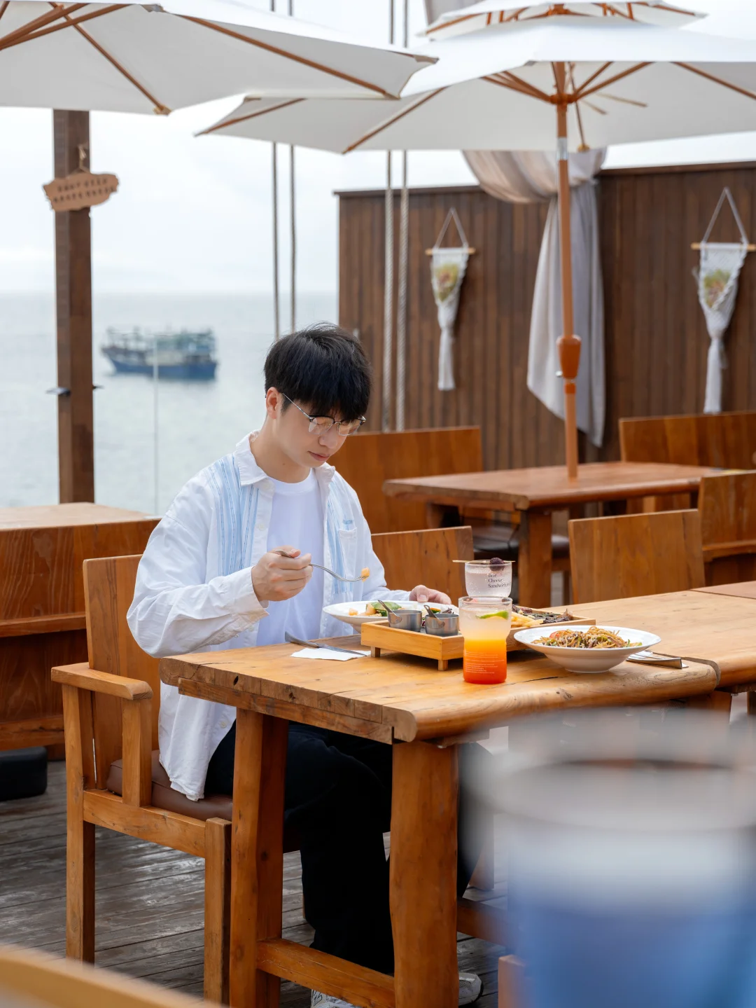 如果走累了,可以到汐善SEASIDE来一份下午茶,这里同样适合打卡拍照。二楼的露天吧台不管是看日落还是拍照都非常出片。 这里有饮品下午茶和正餐,黑椒意面劲道入味,拼盘分量扎实,口味清淡不踩雷。