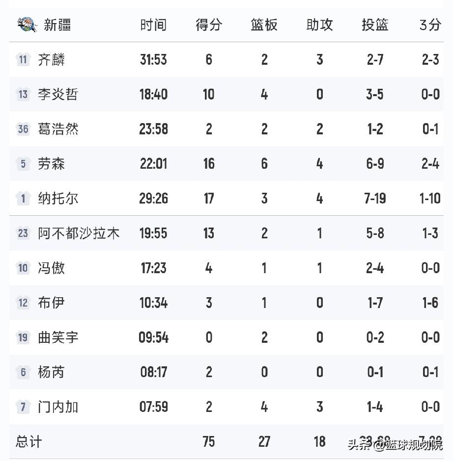 新疆队输在三分球上了,整体三分球28中7,其中外援纳托尔三分10中1,布依6中1!