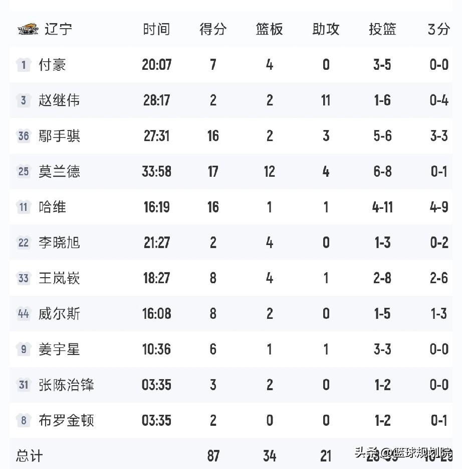 这场比赛,辽宁男篮两大功臣鄢手琪和哈维。手帝16分2篮板3助攻,其中三分球3中3。哈维16分,其中三分球9中4。当然了莫兰德每场比赛都很重要,这场比赛17分12篮板4助攻3盖帽的两双数据。