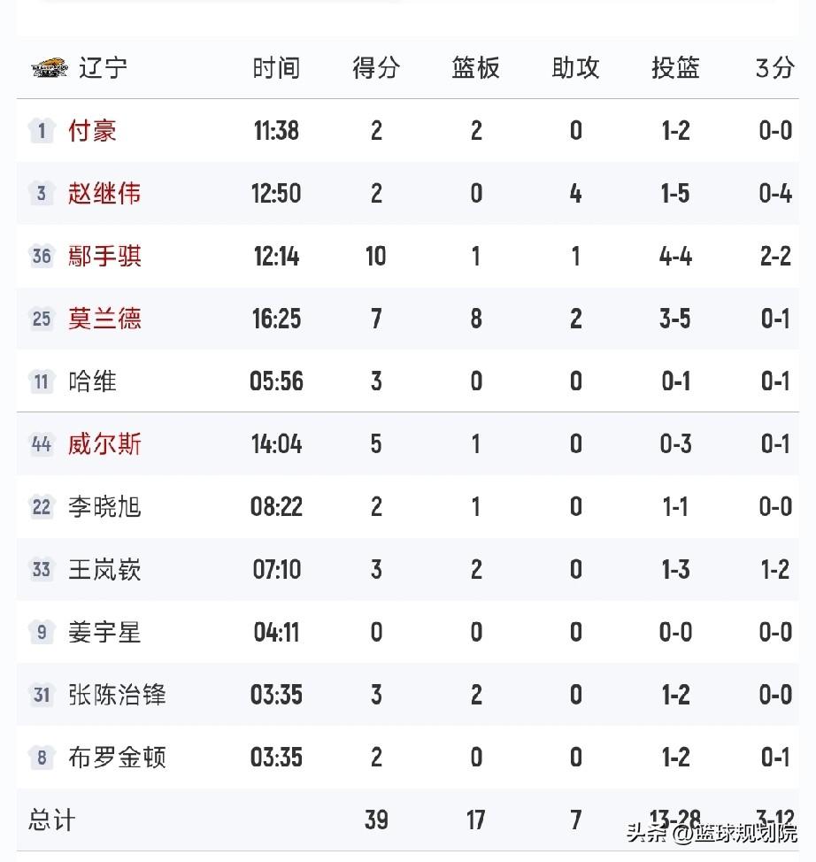 辽宁男篮这边鄢手琪发挥出色拿到10分,其中三分球2中2!