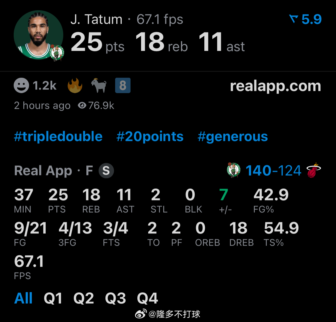 打到最后2分半,塔图姆终于休息了,25分18篮板11助攻2抢断,复出以来的首个三双完成