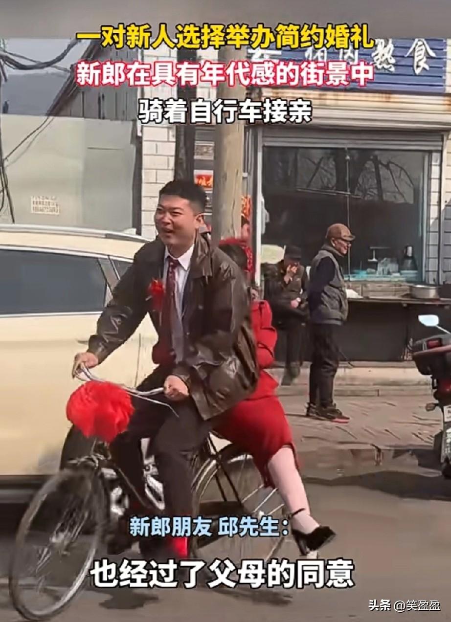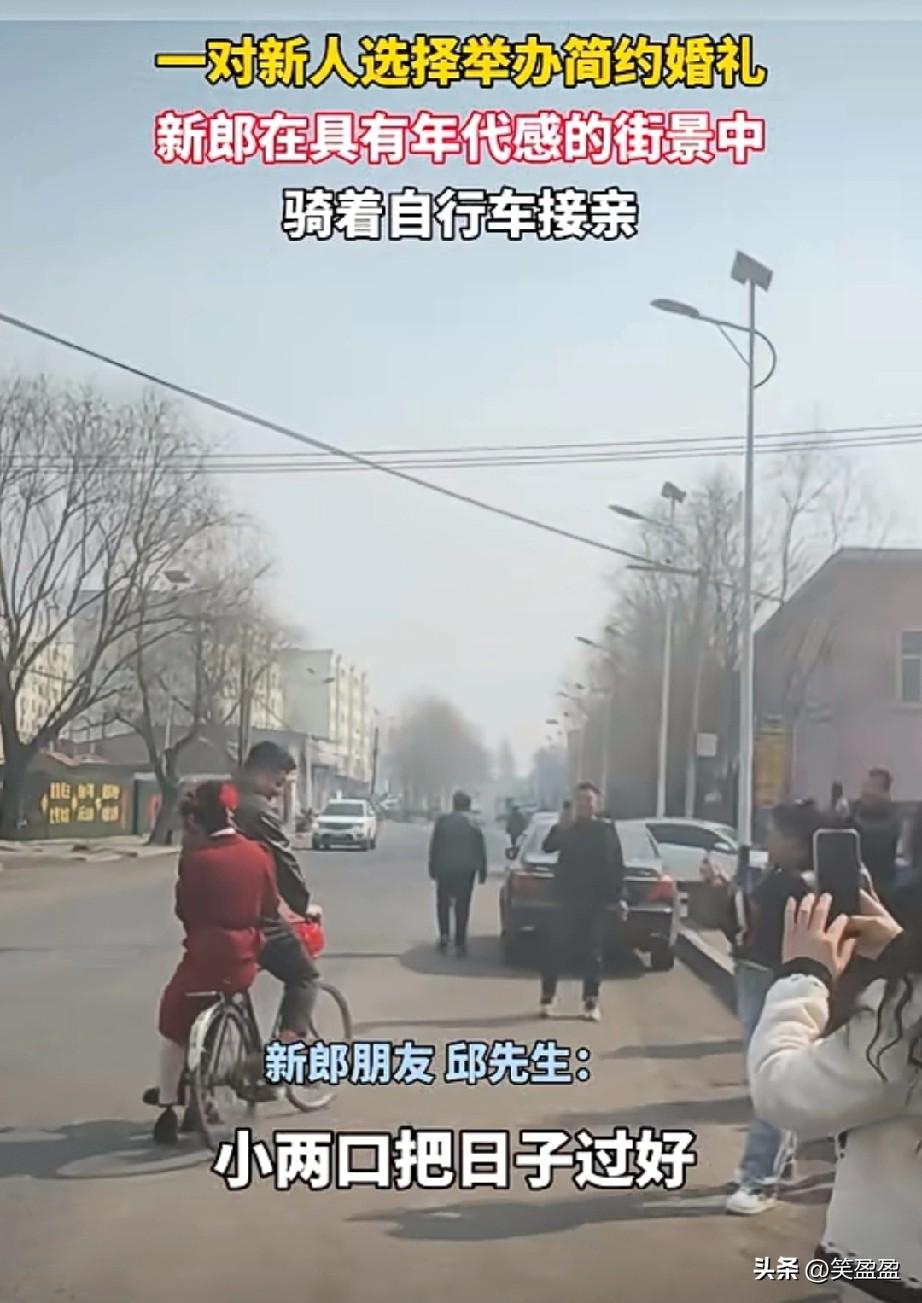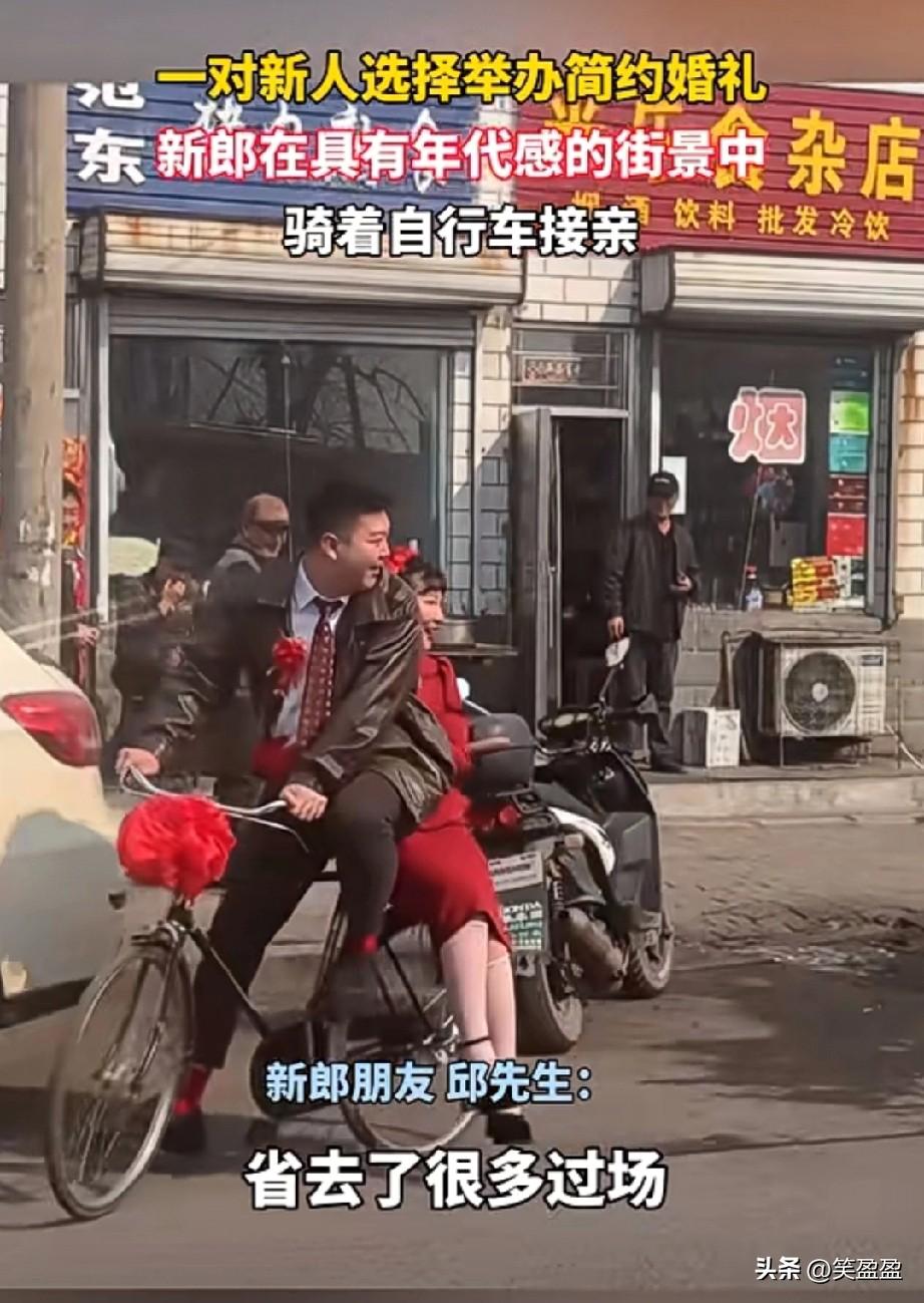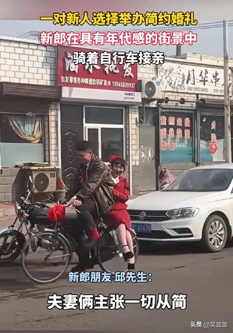 一对新人选择举办简约婚礼 新郎在具有年代感的街景中 骑着自行车接亲 能这样成功