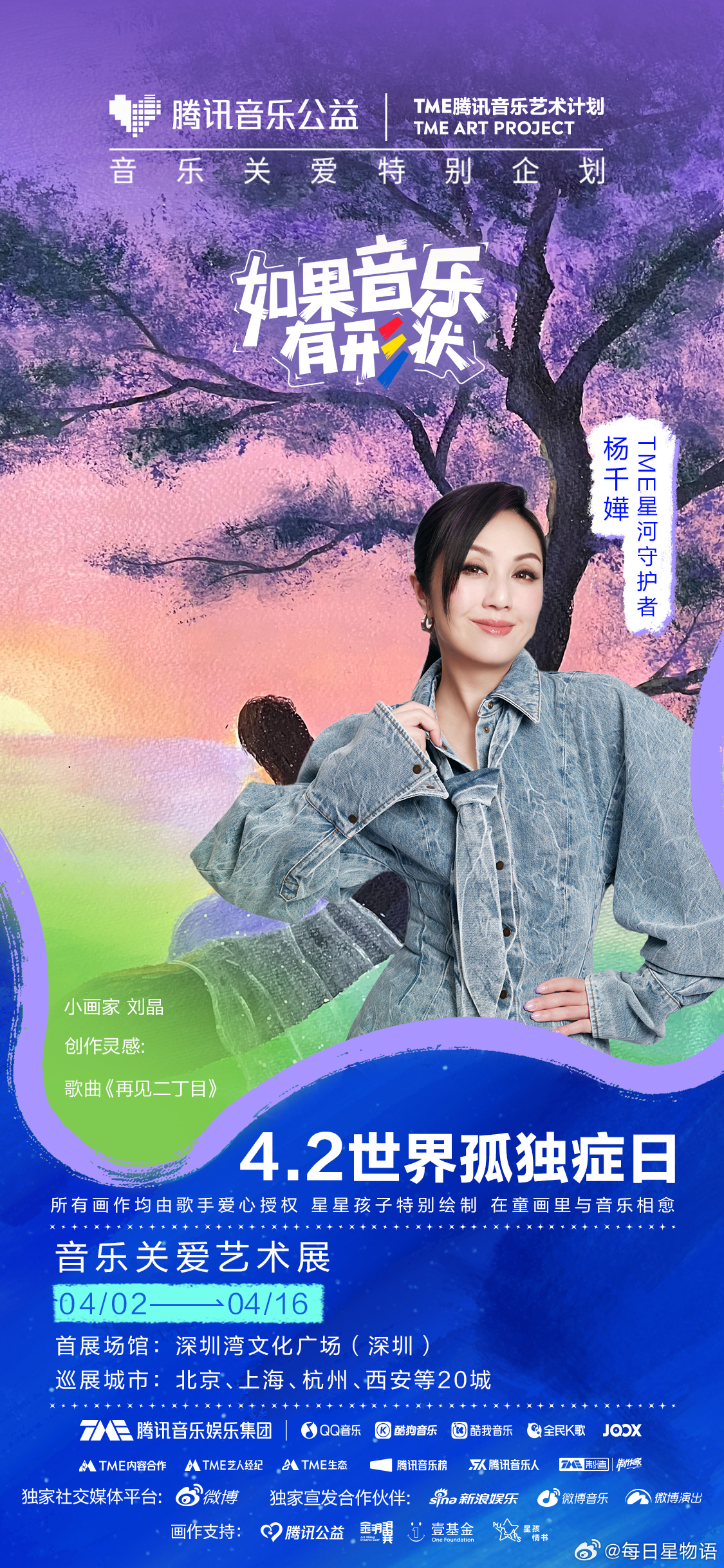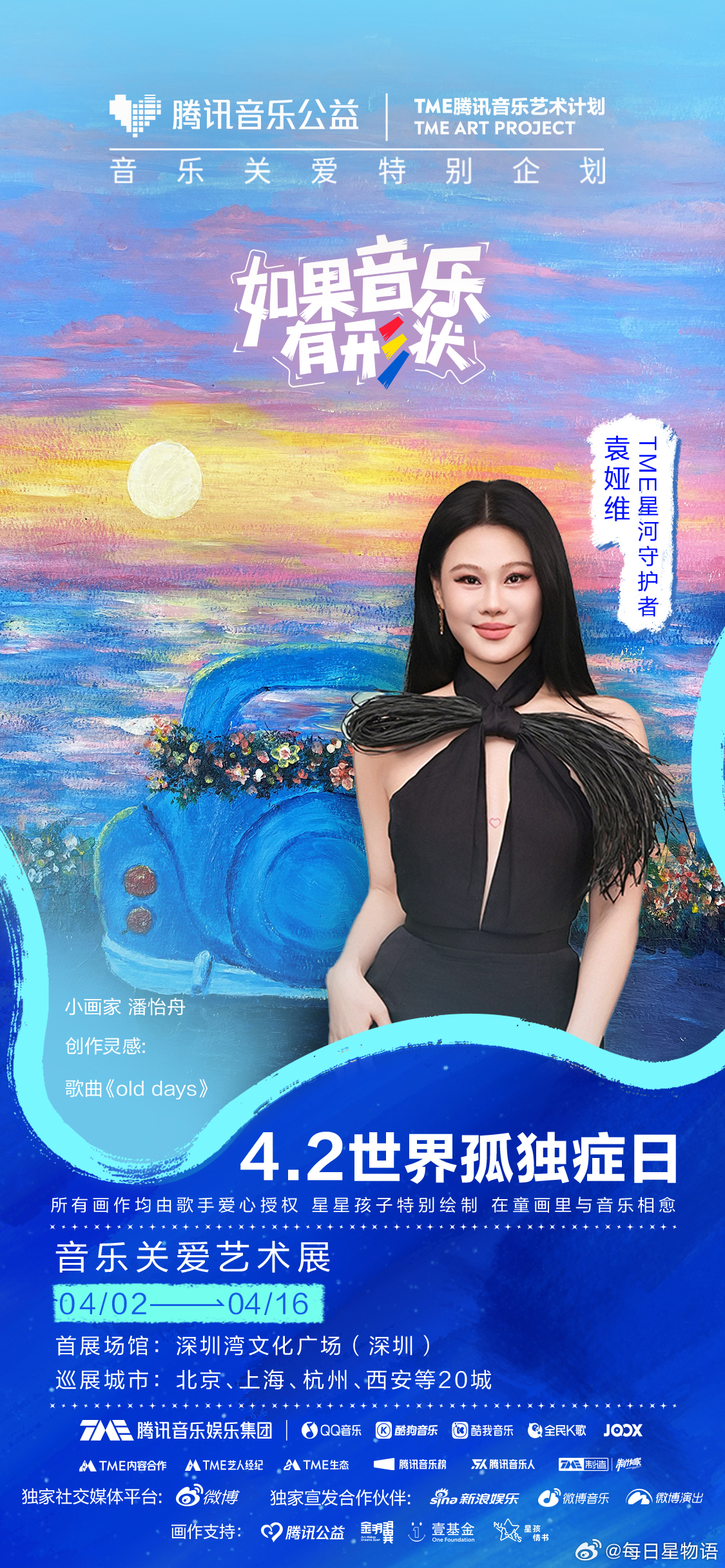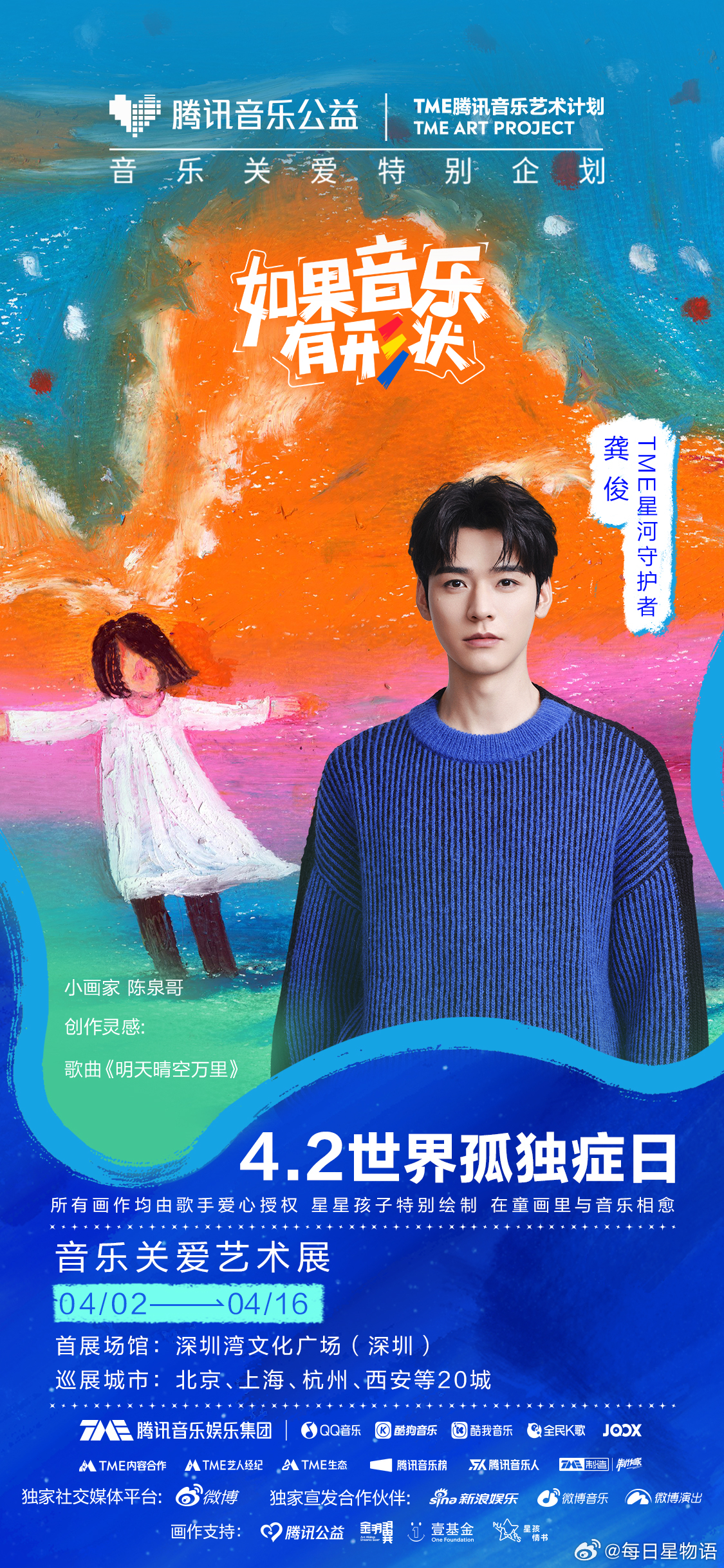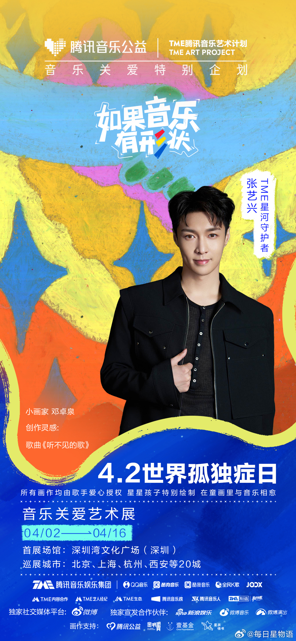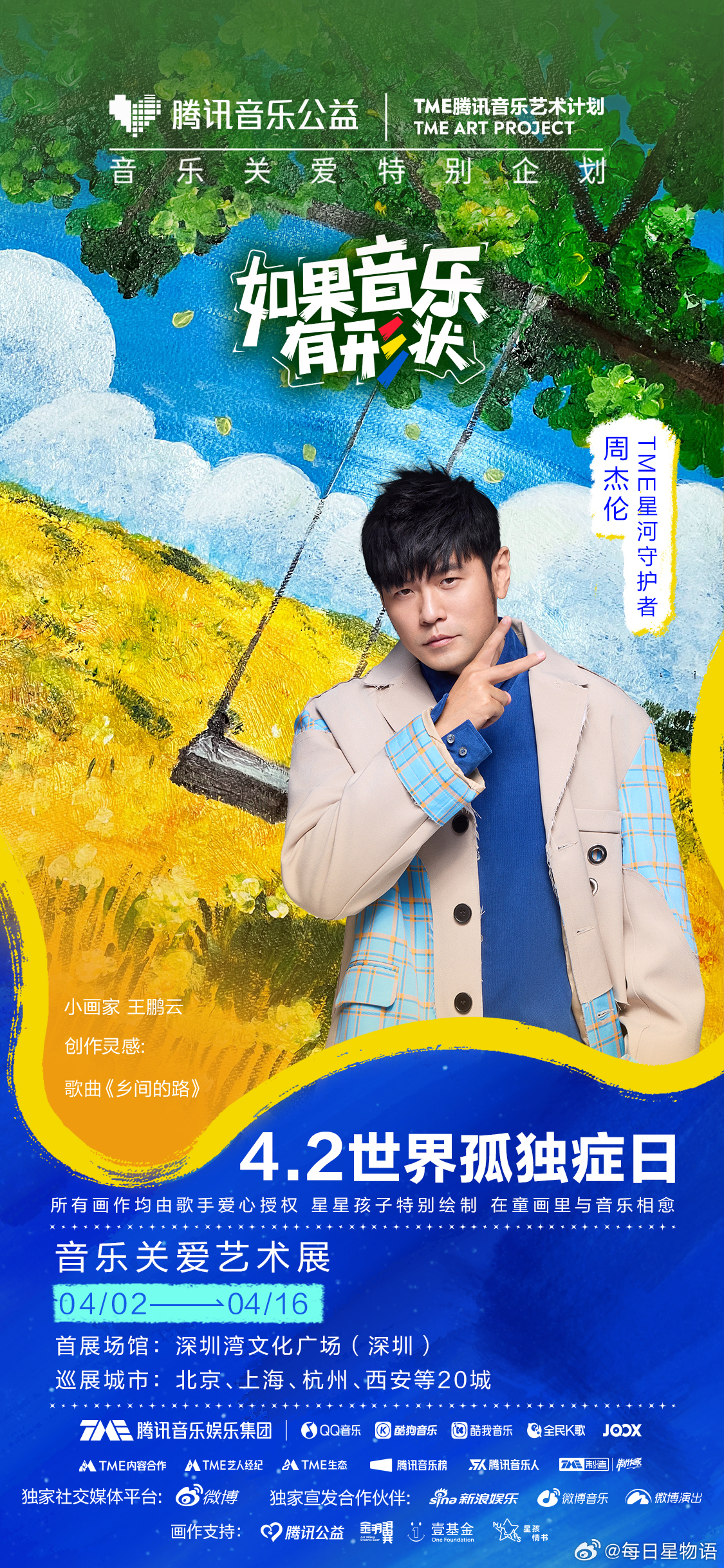 群星唱给孤独症儿童的歌如果音乐有形状 在第19个世界孤独症日,TME孤独症音乐关爱特别企划 迎来发声的第10年。携手“TME星河守护者”周杰伦 ,让我们在旋律与画笔间,共同守护那份独一无二的纯真与闪耀,让爱在音符中温柔相“愈”。