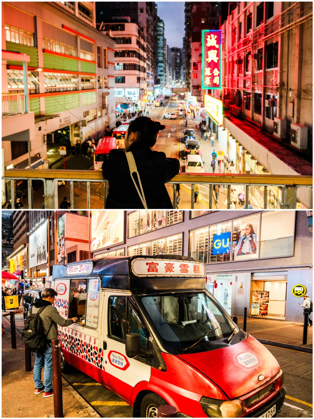 逛完街必去旺角天桥看夜景🌃,从旺角地铁站B3出口上楼,眼前人潮、霓虹层层交织,巴士🚌的士🚗穿梭楼宇间,喧嚣中藏着鲜活烟火气,杂乱中自有秩序,尽显旺角魅力。