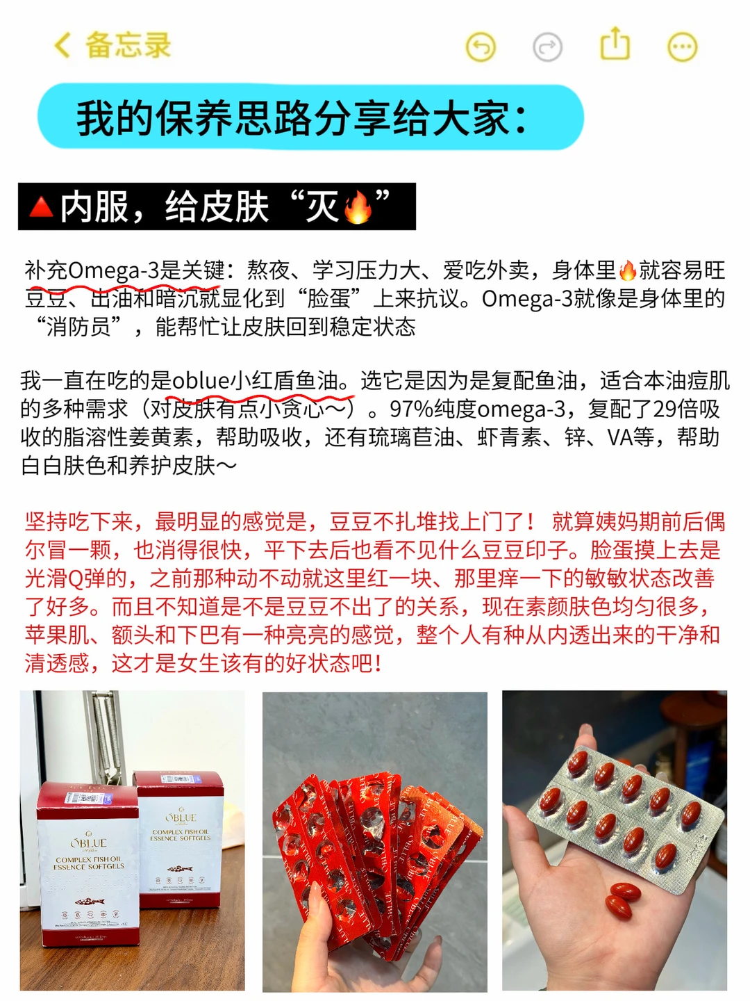 我一直在吃的是oblue小红盾鱼油。选它是因为是复配鱼油,适合本油痘肌的多种需求(对皮肤有点小贪心~)