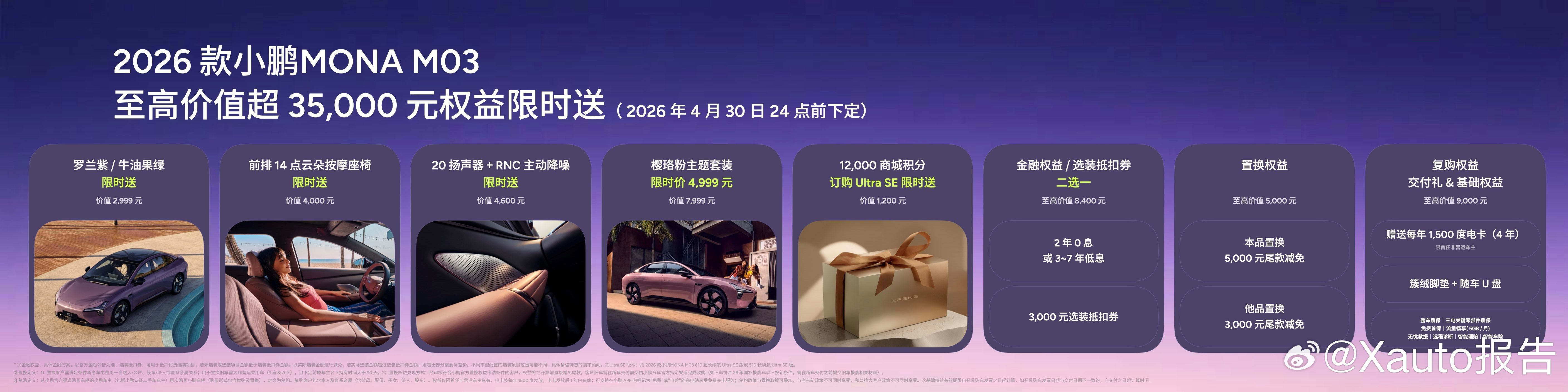 品牌同步推出上市专属权益,即日起至2026年4月30日24点前下定2026款小鹏MONA M03,限时送至高价值超35,000元权益。