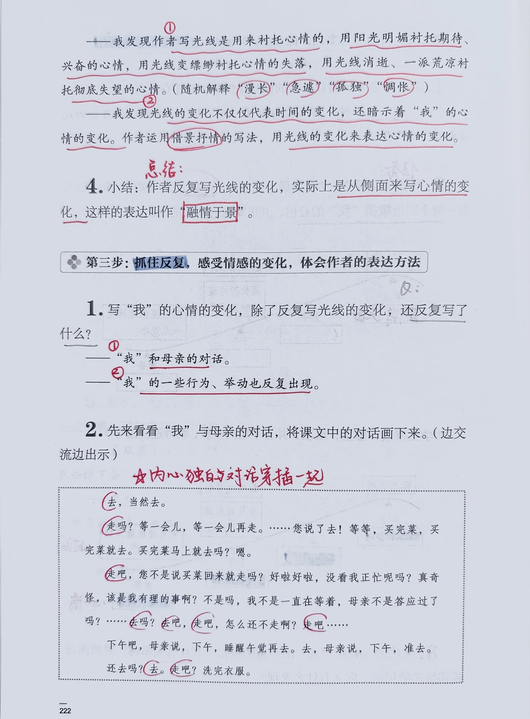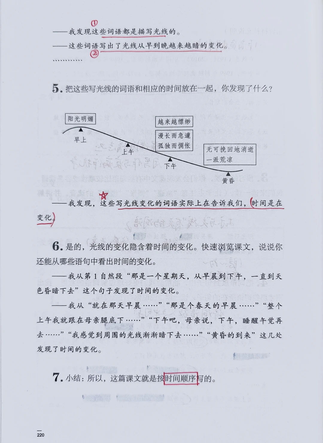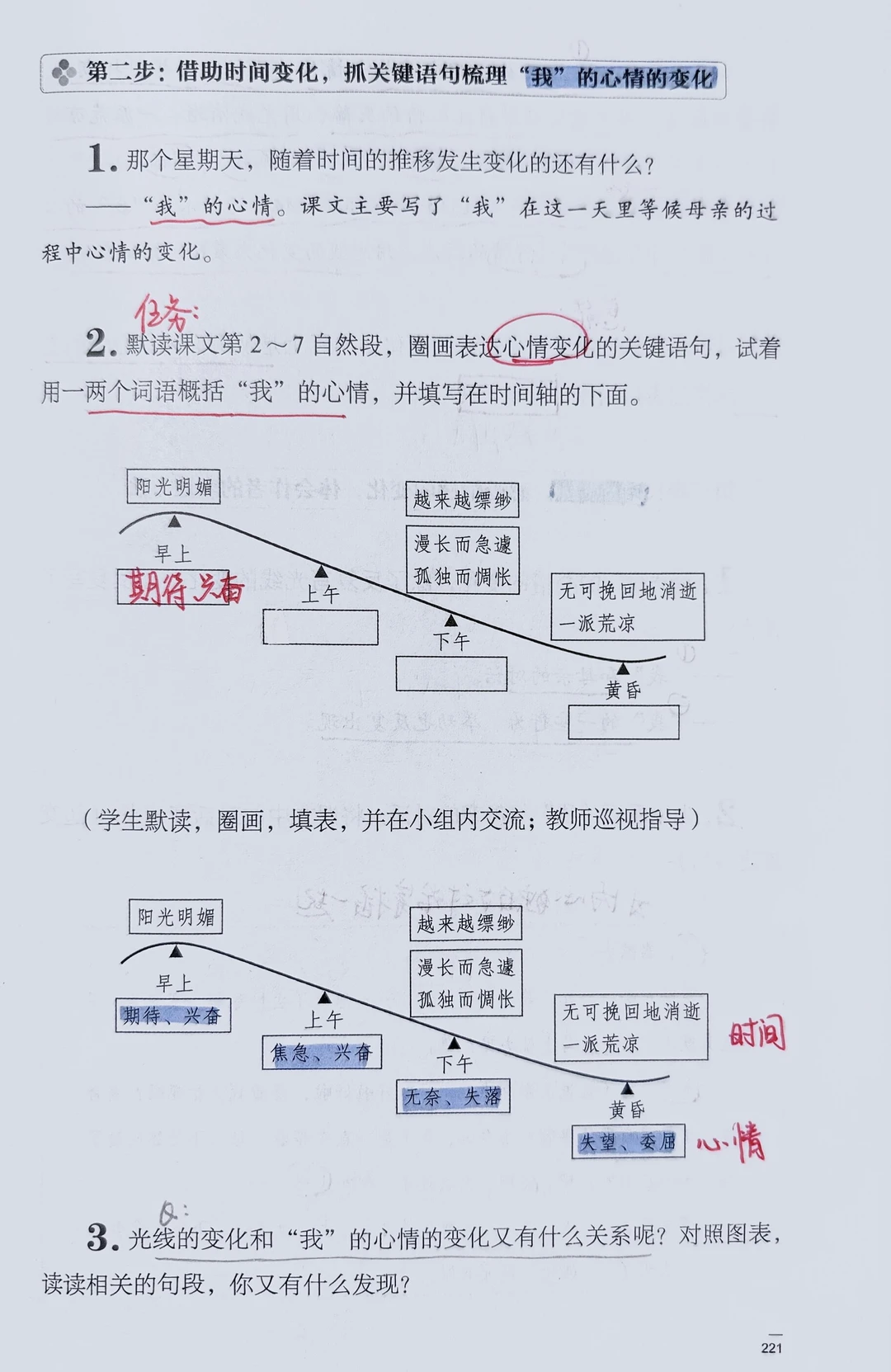 [二R]梳理文中关于“光线和时间”的词语,探讨其与心情变化之间的关系;