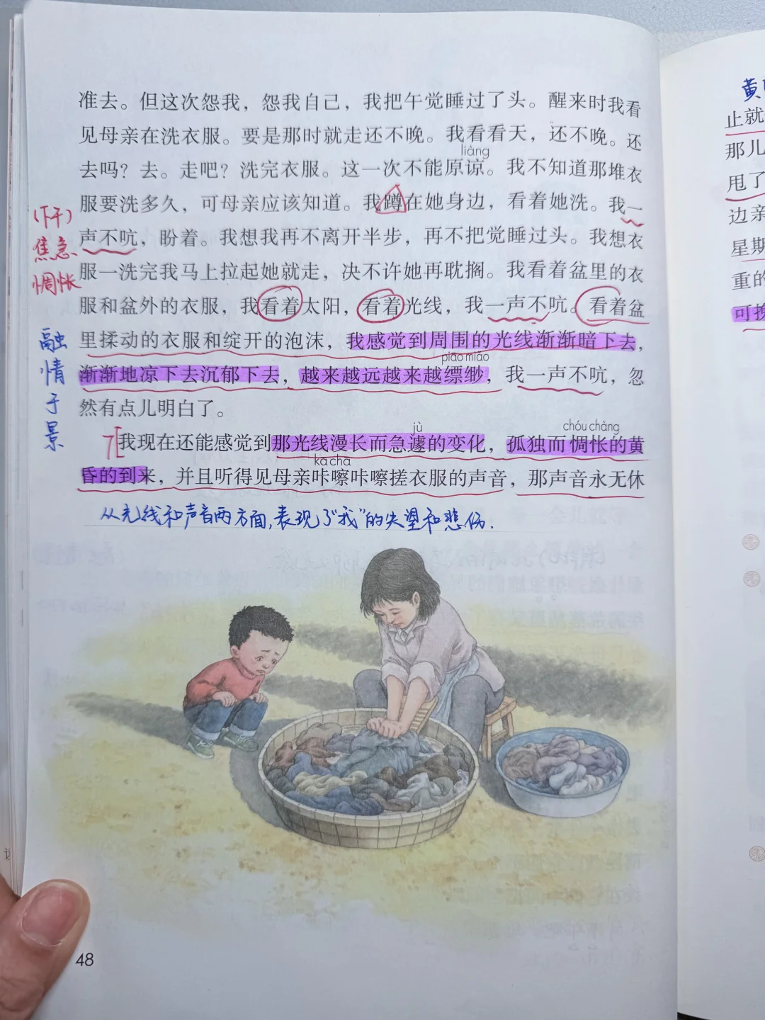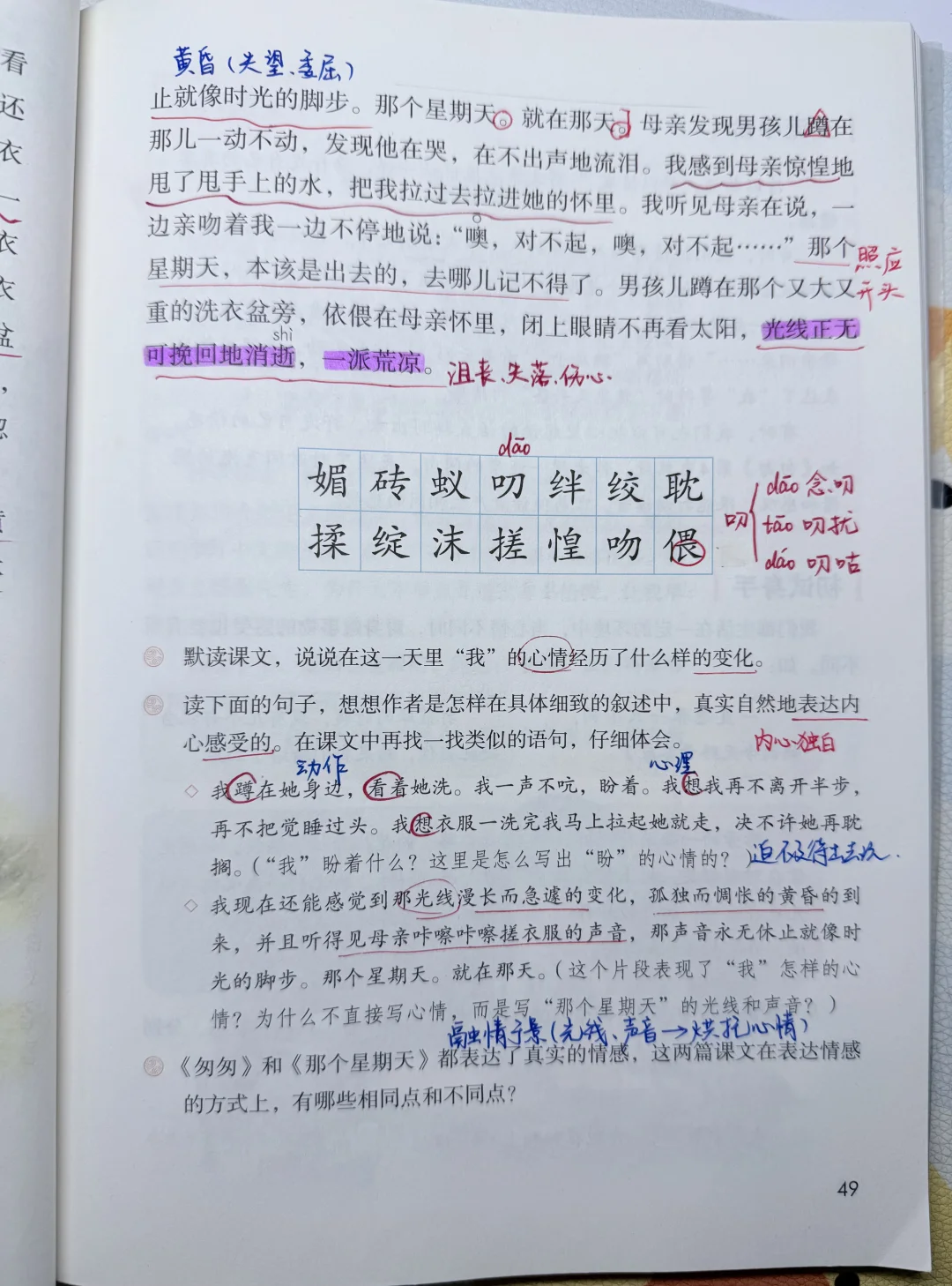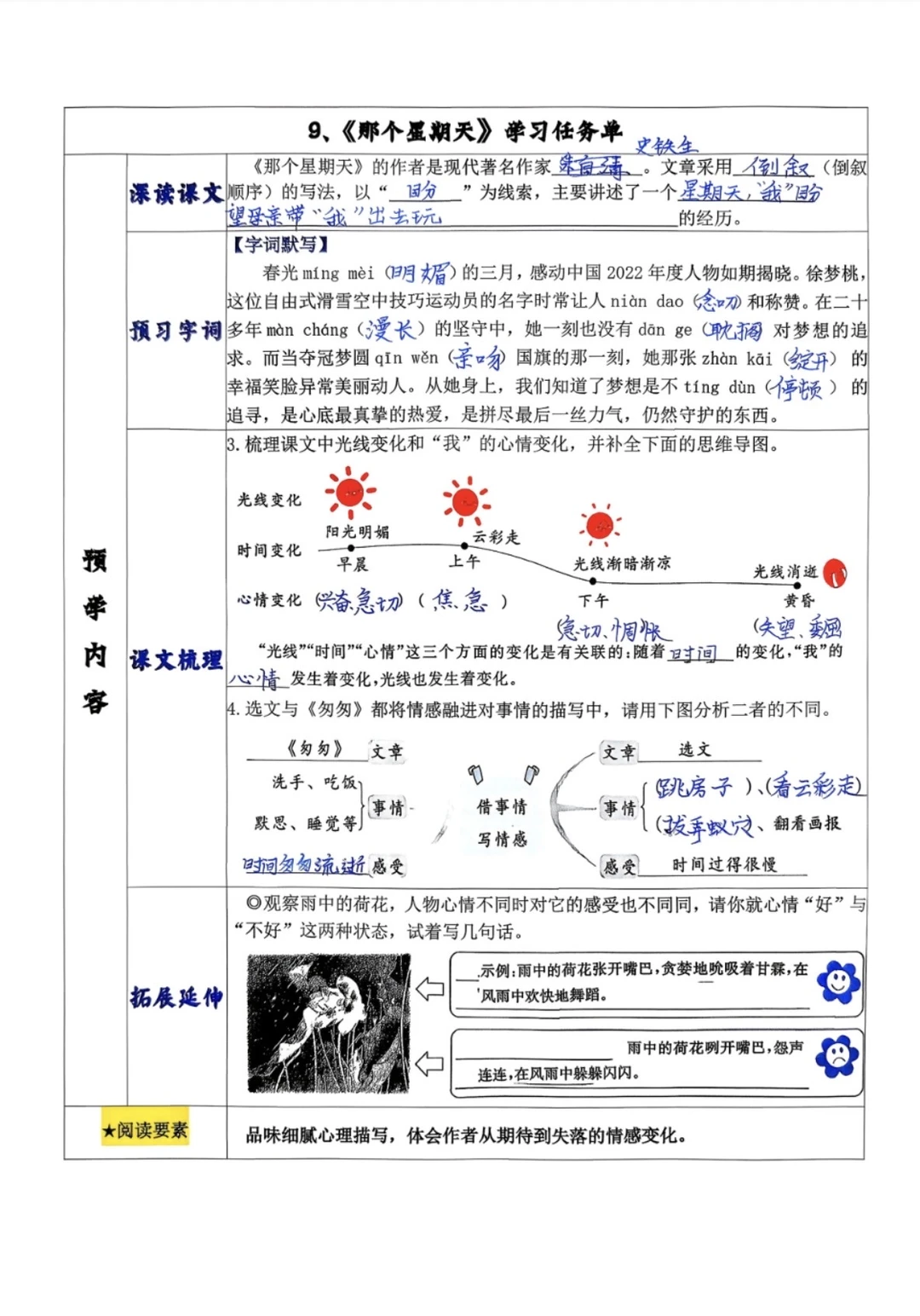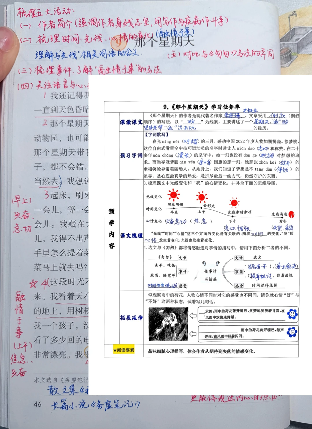 [二R]梳理文中关于“光线和时间”的词语,探讨其与心情变化之间的关系;