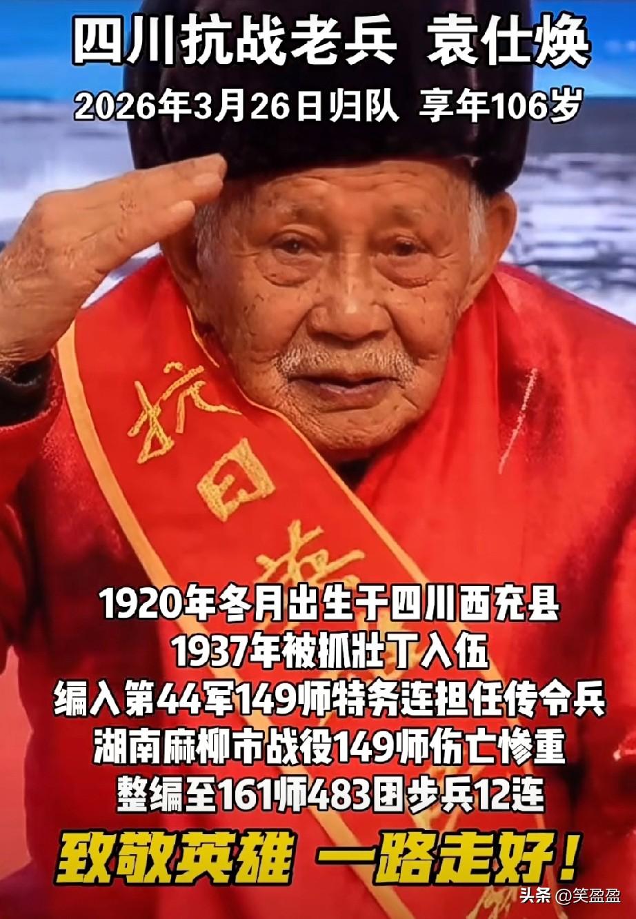 四川西充抗战老兵袁仕焕,于2026年3月26日9时30分归队,享年106岁。致敬英雄,您一路走好[祈祷]