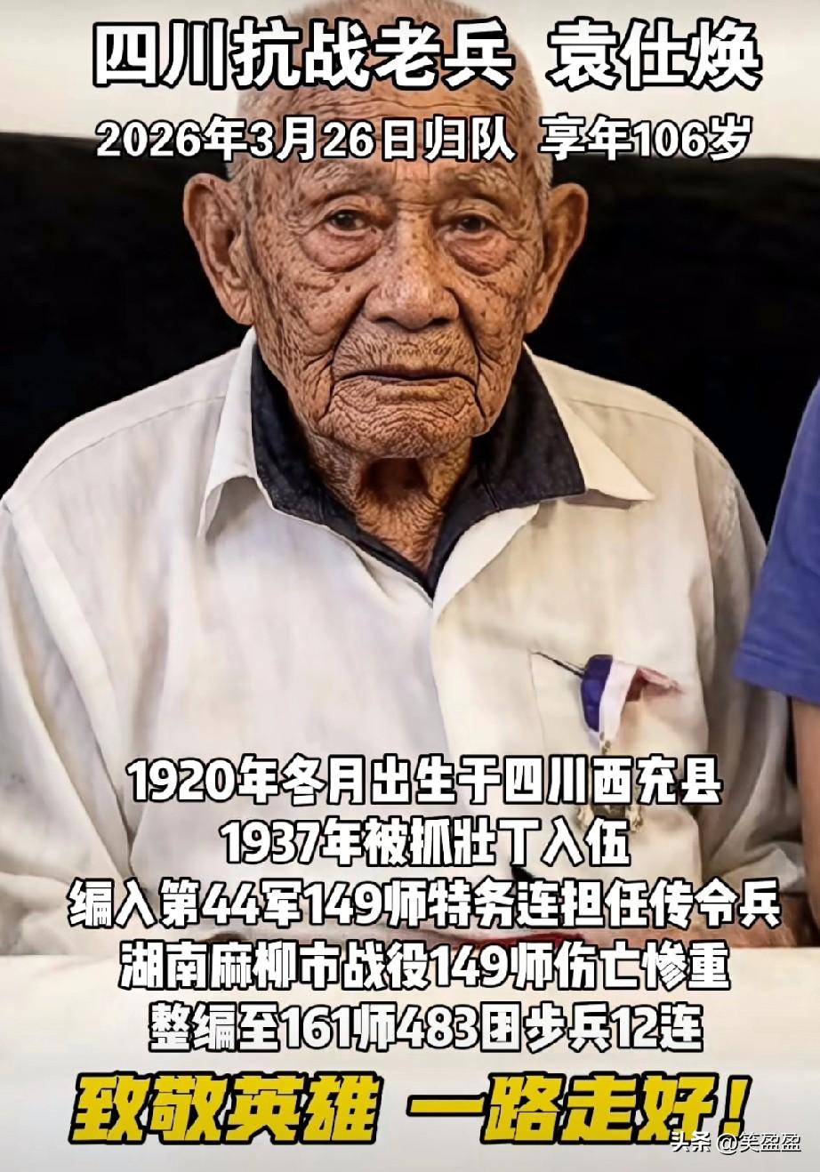 四川西充抗战老兵袁仕焕,于2026年3月26日9时30分归队,享年106岁。致敬