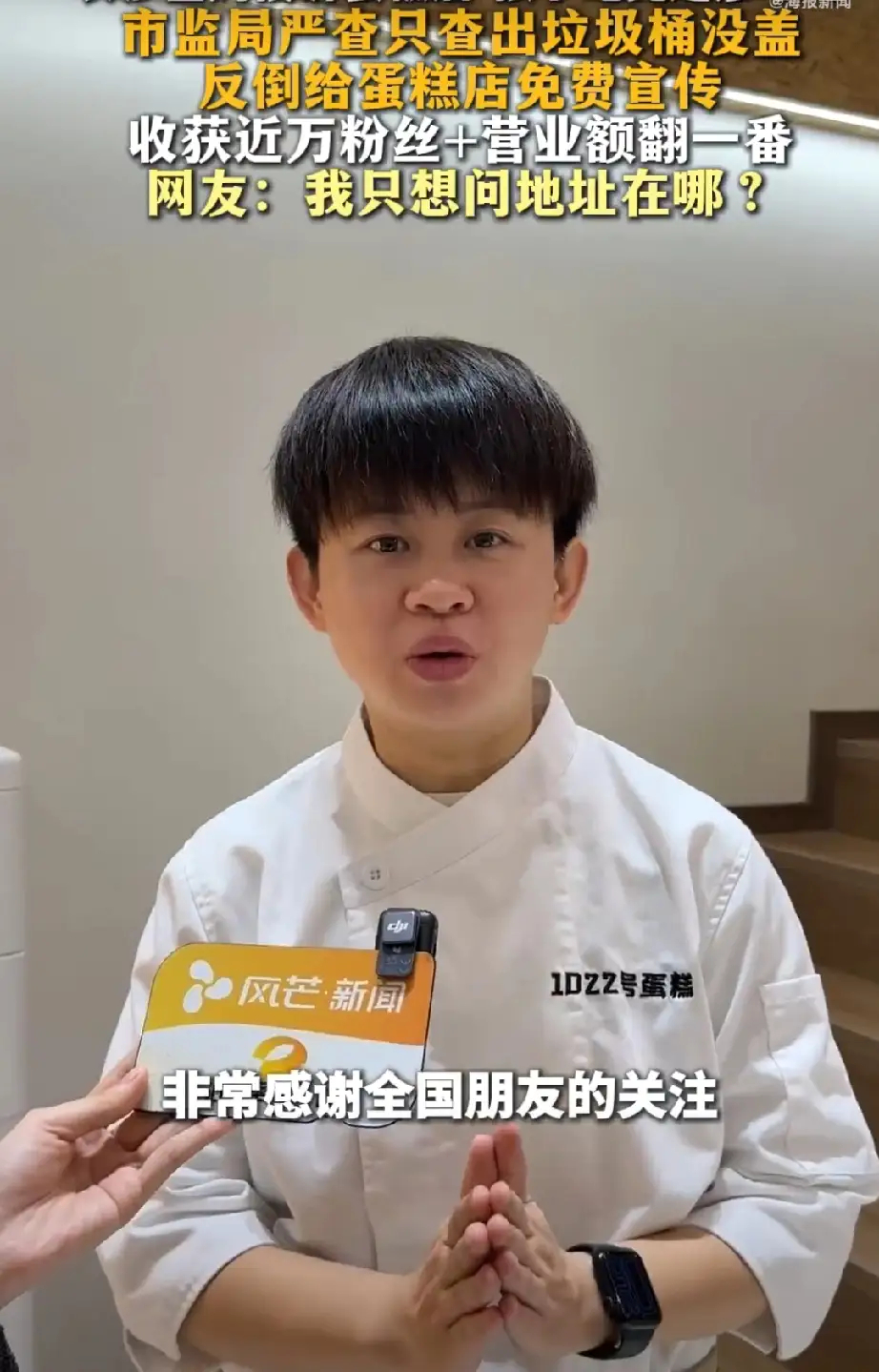市监局工作人员介入调查后,只查出垃圾桶没盖,该店证件齐全所用食材也新鲜,反倒成了蛋糕店的免费宣传。