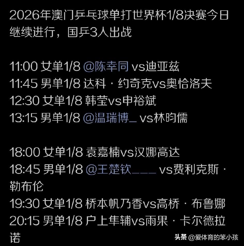 最后,让我们再次祝福王楚钦和温瑞博,期待他们在今天的比赛当中贡献精彩并双双闯进男单八强,也让我们一起期待最终答案的揭晓。
