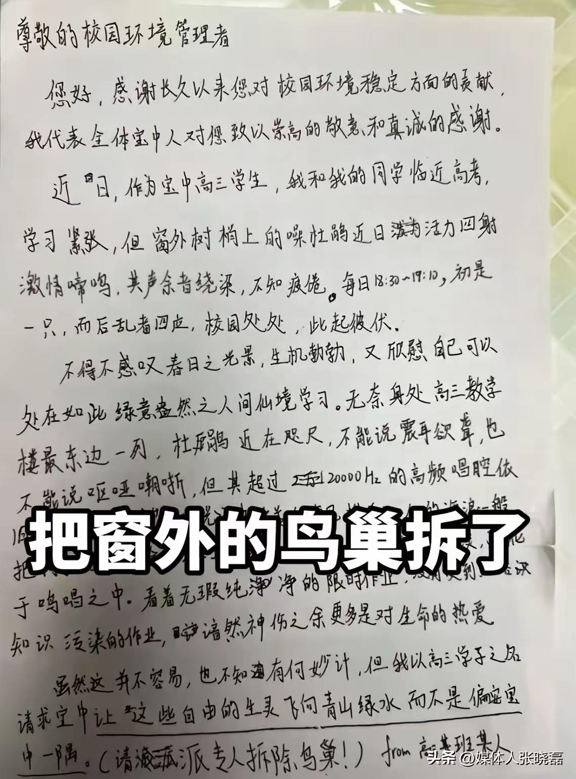 正值高考冲刺的关键阶段,每一分每一秒对高三学子来说都弥足珍贵。一位身处备考漩涡的学生,被窗外鸟巢里持续不断的鸟鸣声打扰,心烦意乱之下,提笔给校长写了一封信,言辞恳切地请求校方拆掉窗外的鸟巢,给自己营造一个安静的学习环境。
