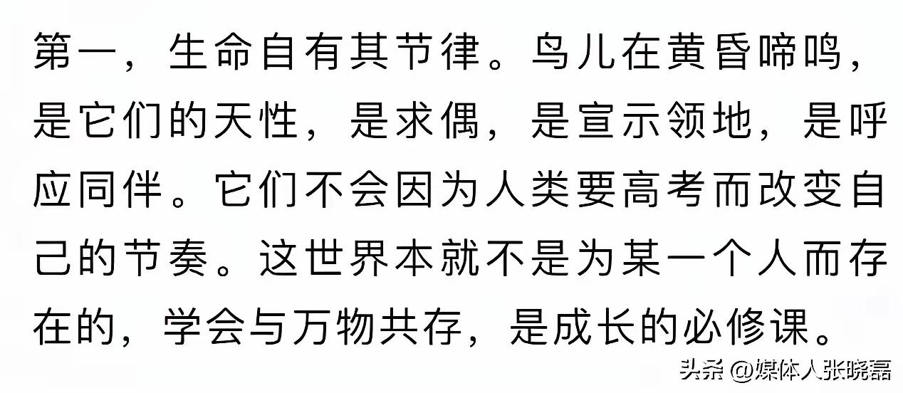 没有指责,没有敷衍,更没有一味迁就学生的诉求,校长没有把这件事当成单纯的噪音困扰去解决,而是把它变成了一堂最生动的生命教育课。高三的我们,总觉得备考就是全世界,所有的一切都该为自己的前途让路,习惯了以自我为中心,习惯了让周遭迁就自己的需求,却忘了世间万物皆有生存的权利,鸟鸣是生命的声响,也是自然的馈赠。