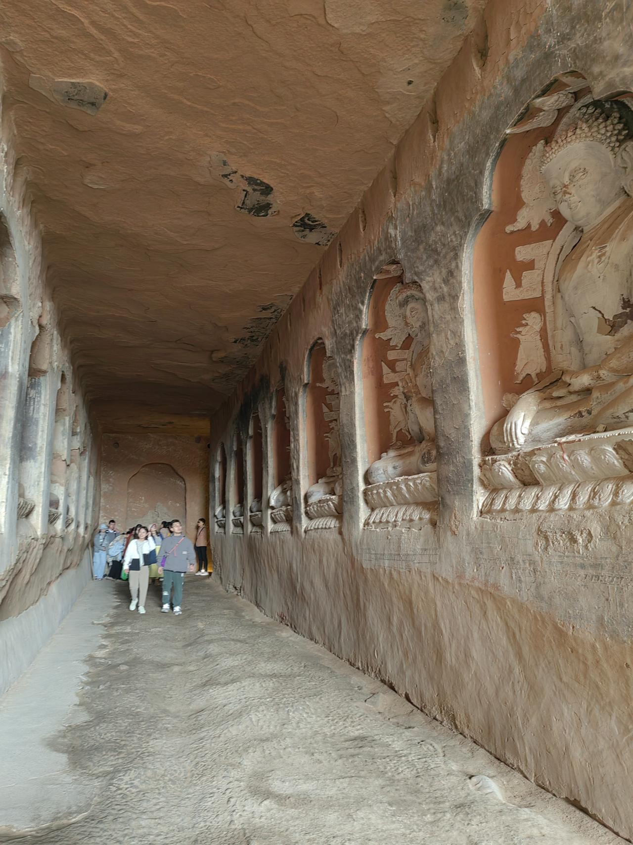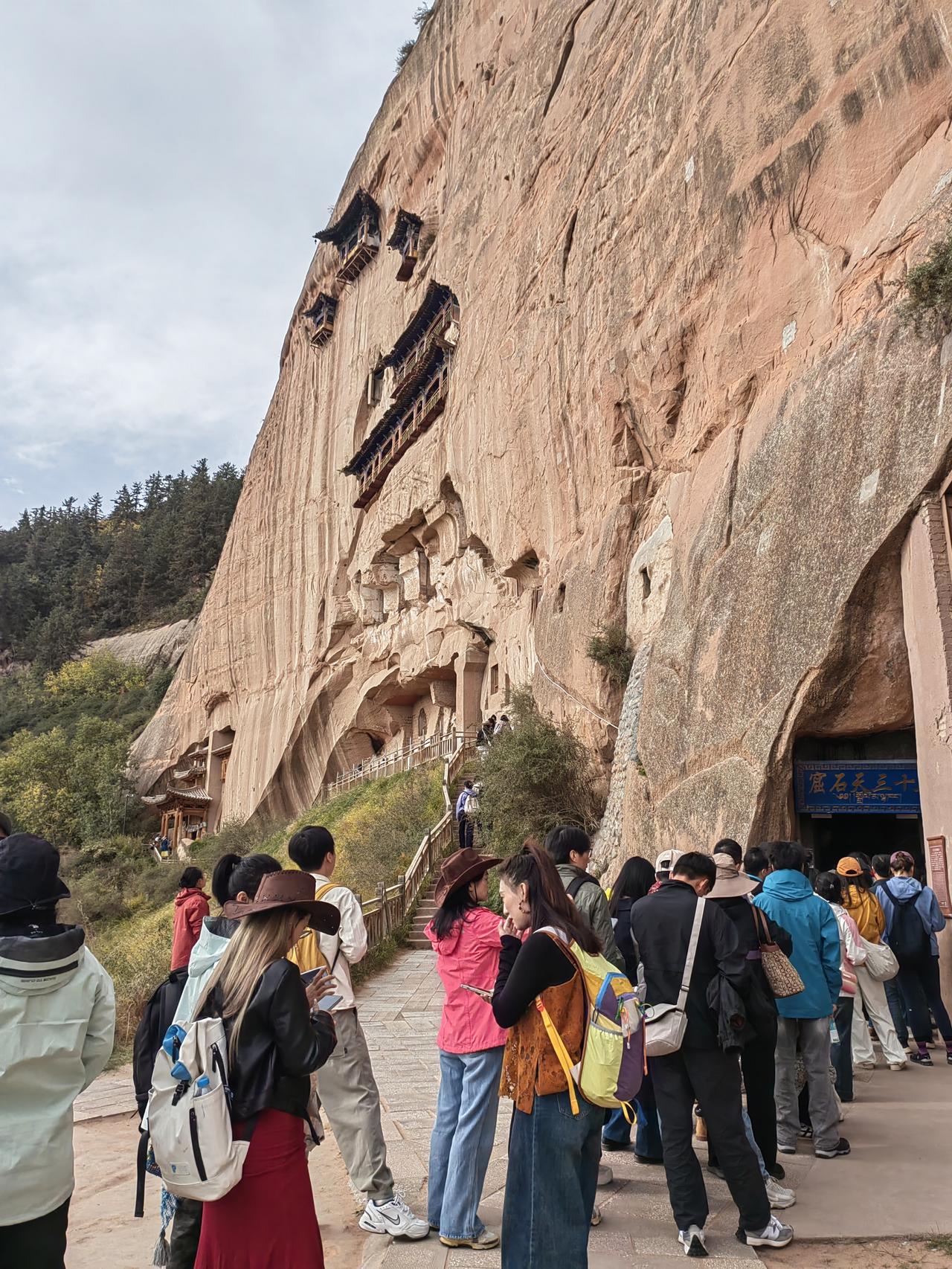 我们虽然也算来得早,但景区已经人头涌涌,我们乘上游览车,向着祁连山腹地驶去。深秋的祁连山,秋色明媚,金黄与墨绿交错,像大自然随手泼洒的油彩,浓淡相宜,层次分明。抬头望去,祁连山主峰已覆上一层薄雪,洁白峰顶在蓝天映衬下清冷圣洁,山下却是热烈绚烂的秋,一冷一暖,一静一动,勾勒出独属于祁连的壮阔与温柔。沿途经过千佛洞等景点,但我们记住司机的话,一直到千佛洞停车场才下车,下车后沿着环山路往上爬,这一段大概六、七百米的环山路爬得我气喘吁吁,终于在白塔处看到了马蹄寺。只见它嵌于百米垂直的红色山崖中,远远看去像在山壁上画了一座宝塔,这就是著名的三十三天石窟,它7层21窟,顶层还有一块马蹄印石碑,传说是天马留下的。最艰险的是它的栈道,是在山体内凿成的暗道,呈“之”字形曲折,有的通道如垂直隧道、仅容单人攀爬,所以攀爬三十三天石窟非常艰险,有人说没有爬过三十三天石窟就不算游过马蹄寺。