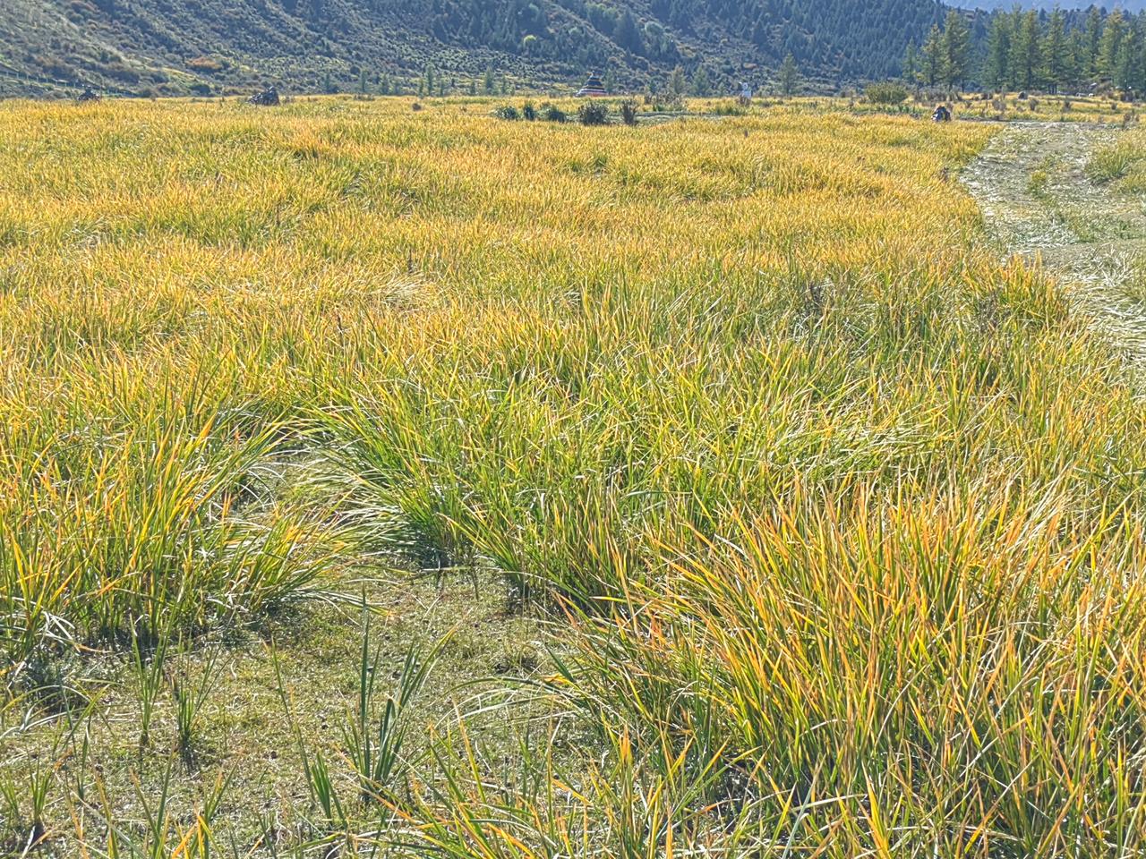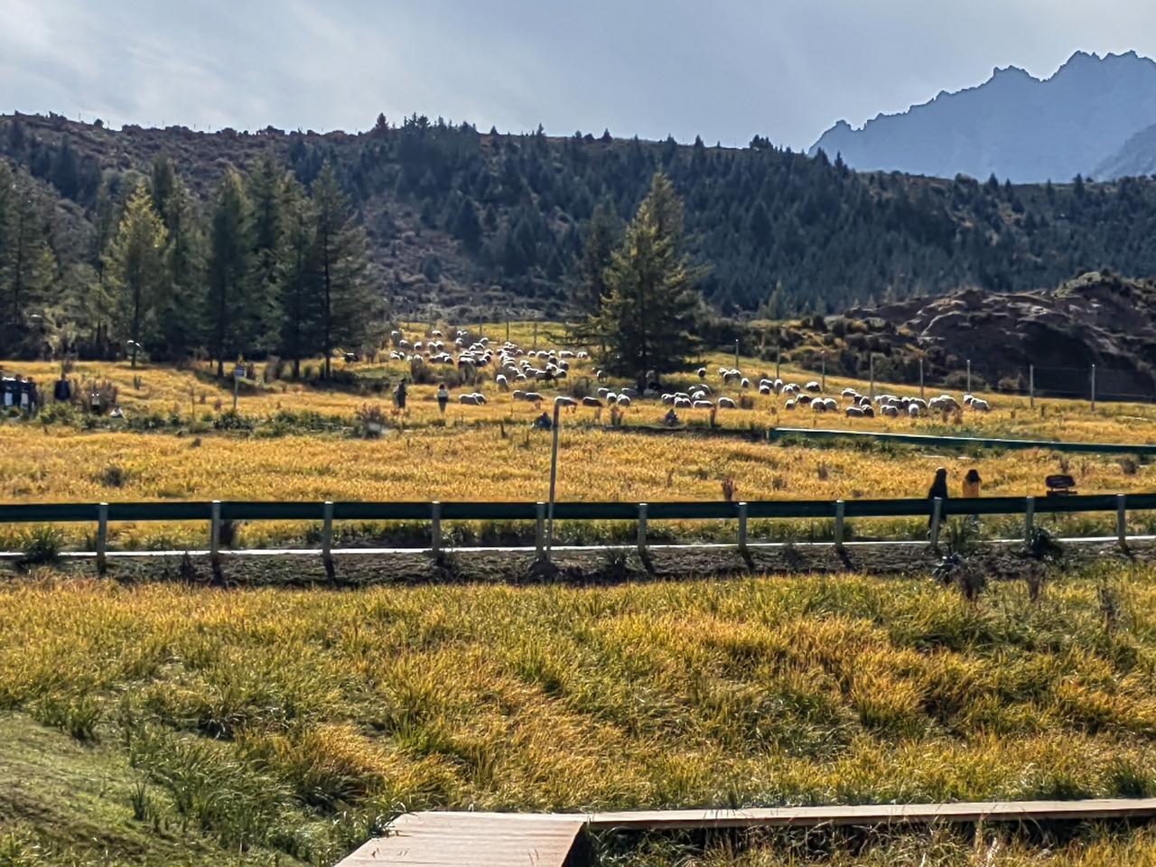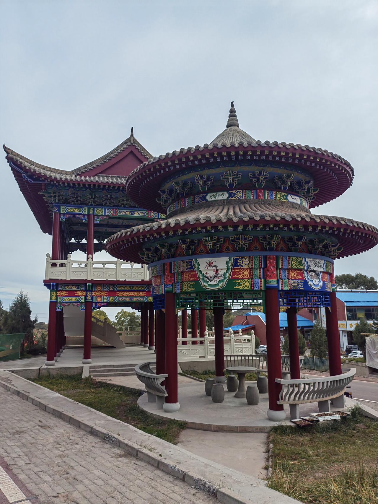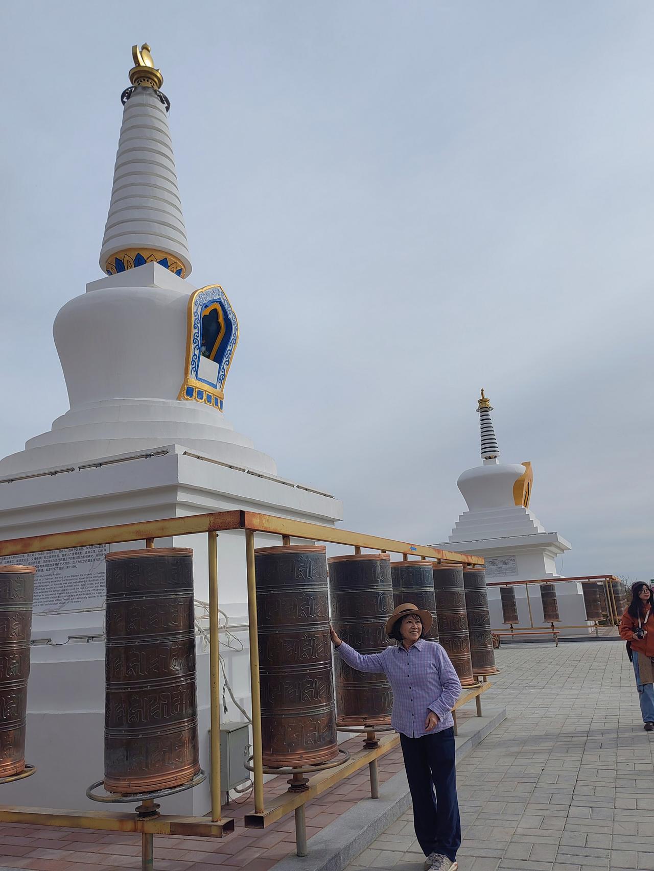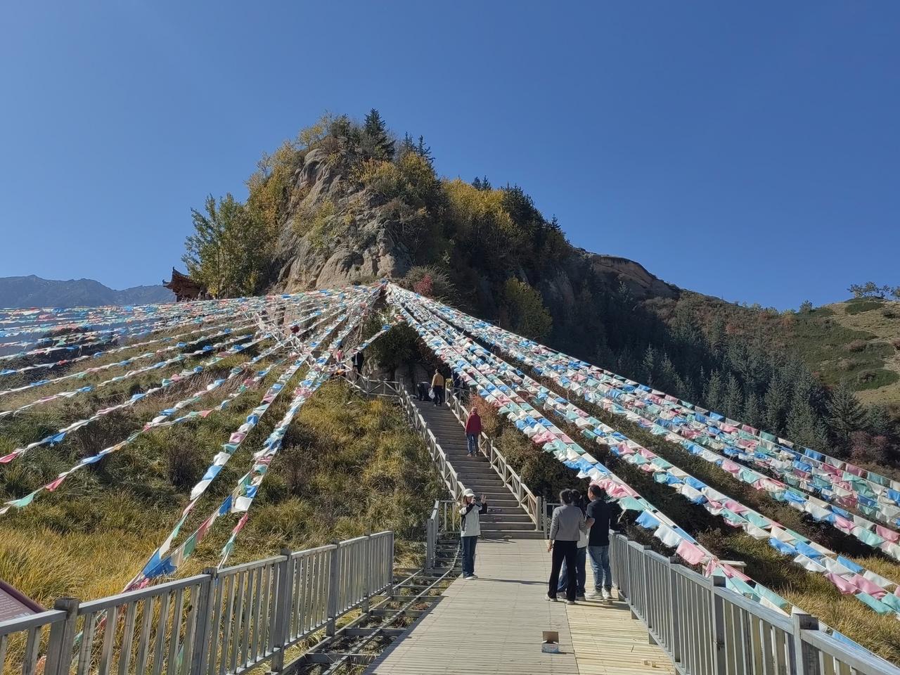 从马蹄寺下来,在路边遇见一只肥硕的土拨鼠,这只土拨鼠很萌很可爱,它一点也不怕人,游客给它面包饼干,它就用爪子接过来塞嘴里吧拉吧拉咀嚼,亮晶晶的小眼睛碌碌转,这家伙是个见过四面的鼠,它知道逗游客玩,换来丰盛的食物,吃得自己脑满肠肥胖乎乎,成为马蹄寺一道风景线。 离开土拨鼠,我再次返回停车场,上了去往格萨尔王殿的游览车,沿山路慢行,秋色愈浓。金黄草甸铺满山坡,牛羊悠闲踱步,远处经幡随风轻扬,为这幅自然画卷添上几分禅意。到了格萨尔王殿,我干脆在草原撒欢。金色的草原才是草原景观的天花板,这时的草原虽然没有夏季草原色彩斑斓的花朵,但秋季的草原每棵草都是一朵盛开的金花,在阳光下闪着金色的光芒,美轮美奂,还有满地的马牛羊悠闲啃草,蓝天白云下如同一幅绝美的油画。这一刻,不必言语,只需静静站着,看阳光漫过山林,洒向雪山草甸,便知人间最美的秋,藏在祁连深处,藏在马蹄寺的一草一木、一崖一窟间。