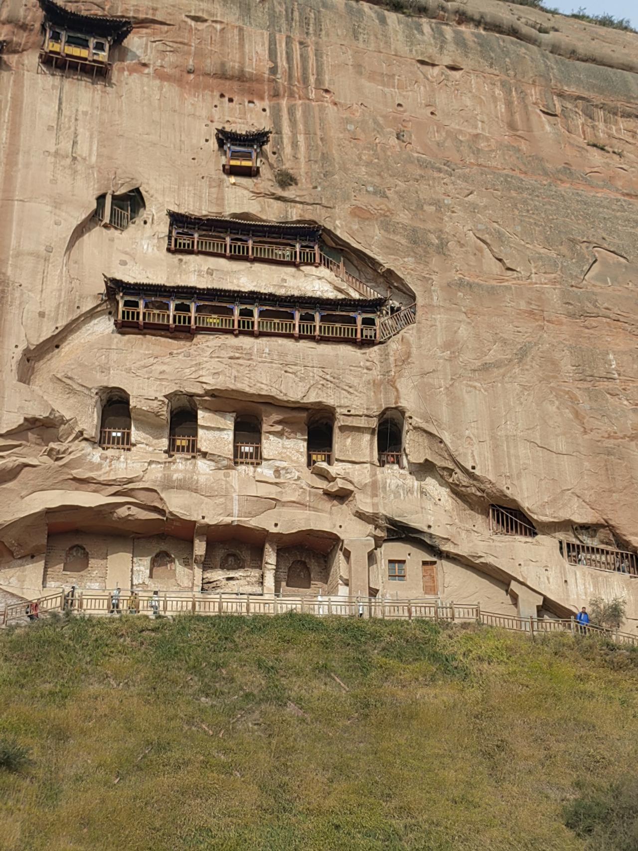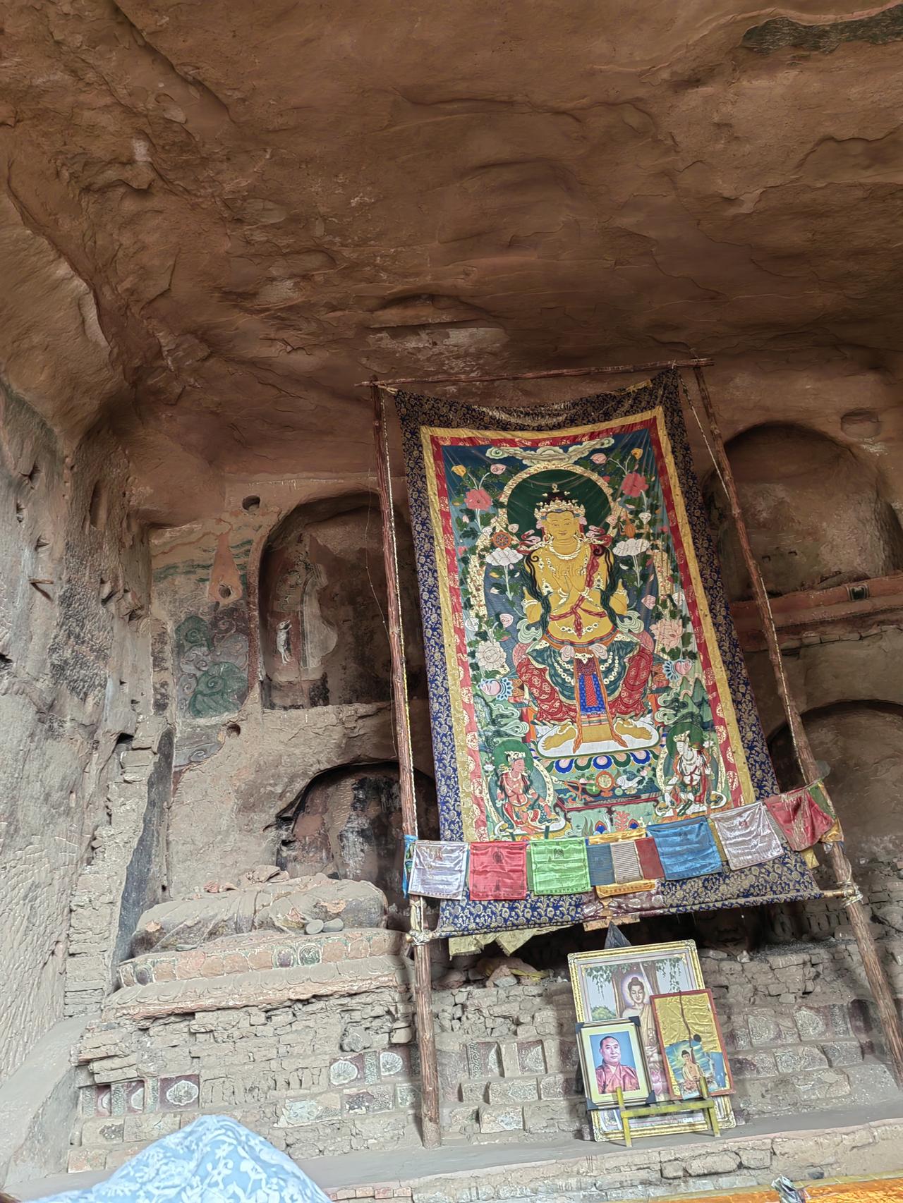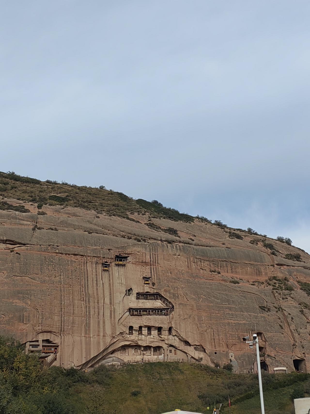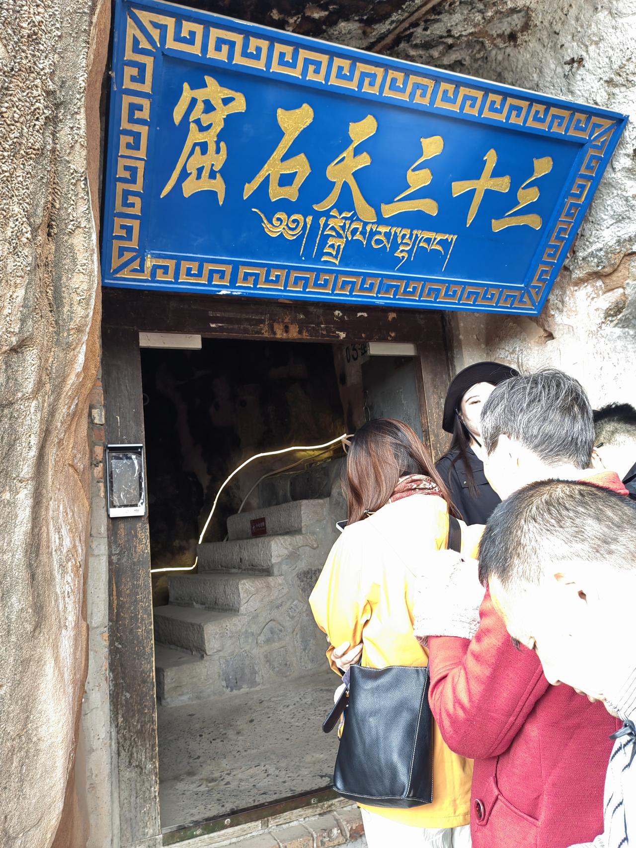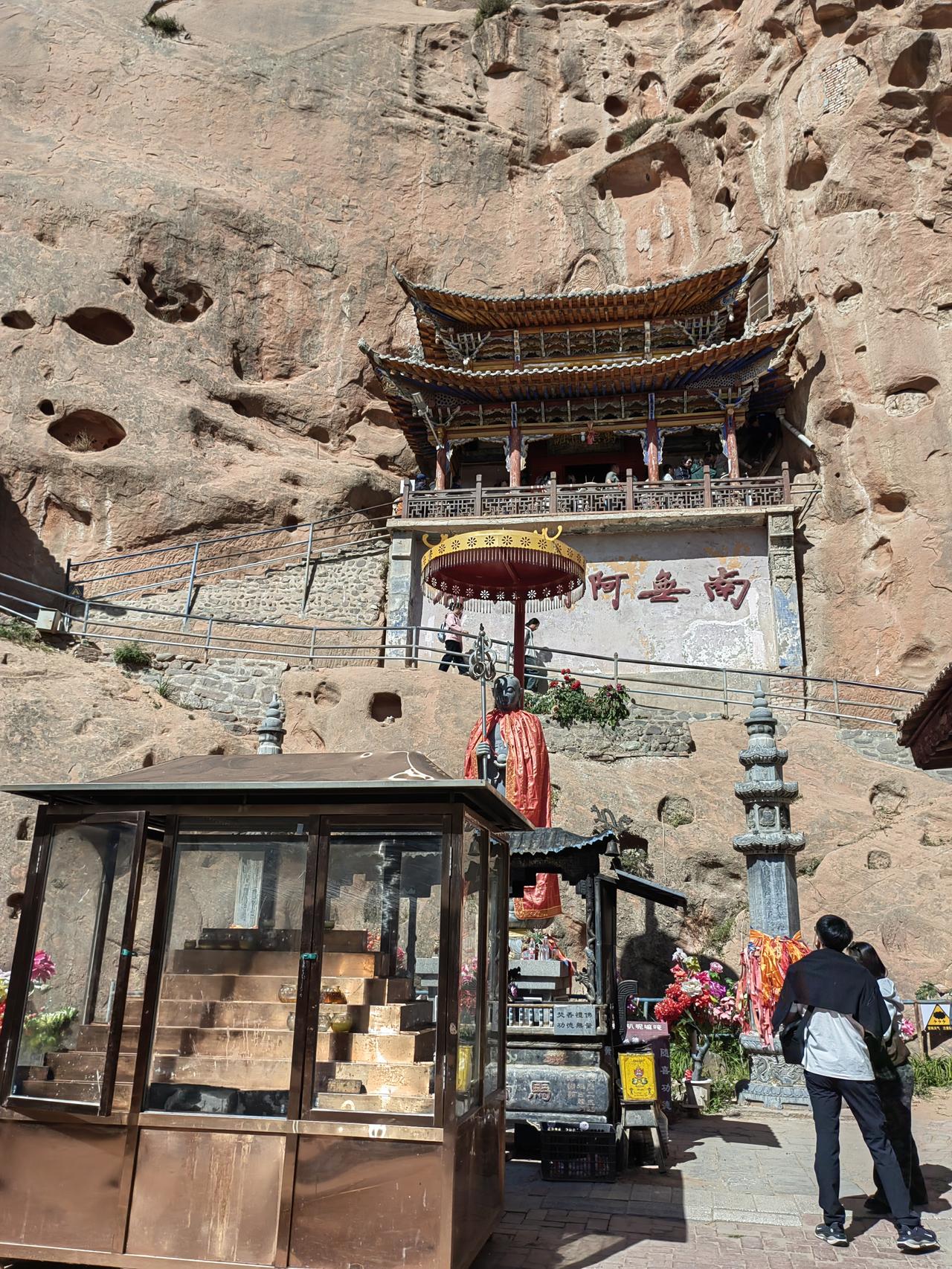 要进马蹄寺还得再买票,当我爬上陡峭的梯级到达一级平台时,三十三天石窟的入口已经排了一条长长的队伍,看到这阵势,我瞬间打退堂鼓,一来我腿脚不好,如果上去到了窄小的通道,一时爬不上必然会阻碍别人,万一堵在通道就不好了,更担心的是,我怕自己会摔倒,虽然三十三天石窟很值得游,但相对自身的安全,我还是不逞强了。于是我就在周围逛逛其实的石窟。藏佛殿是我国单体面积最大的佛教石窟之一,此殿规模宏大、里面有一尊8米多高站佛。窟内有一口水井称“八功德圣水”,相传饮用此水可强身健体、祛病消灾。