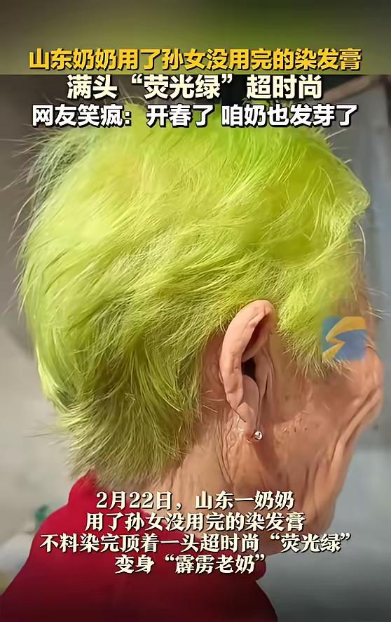 最近山东有个老太,凭着一头浅绿色的头发火出了圈,看过的人都忍不住笑,说这才是开春最接地气的“时尚”,事儿其实很简单,就是2月22号那天,山东一户普通人家的卫生间里,发生了一件特别逗的小意外。