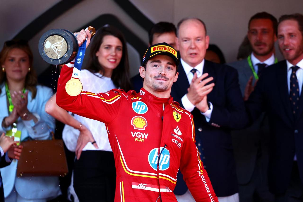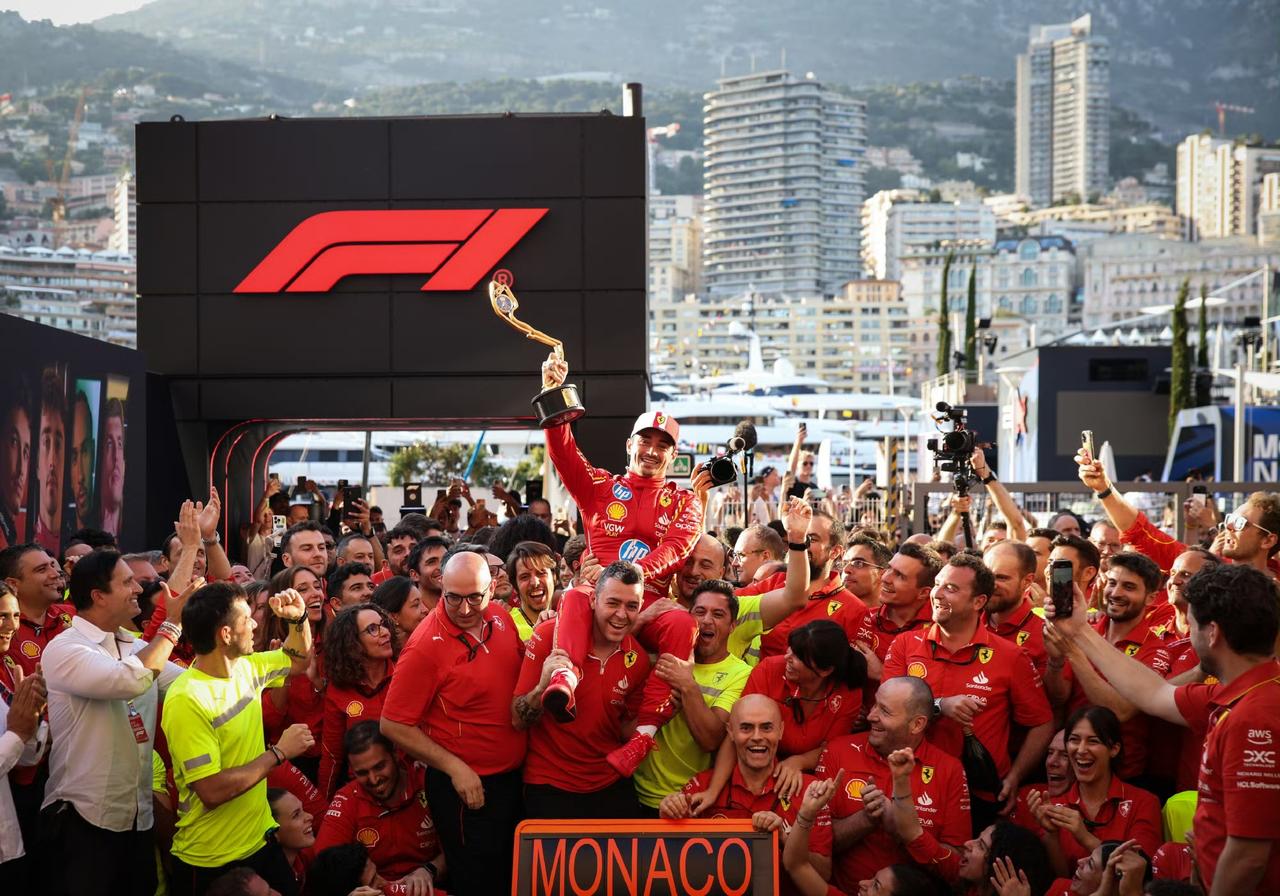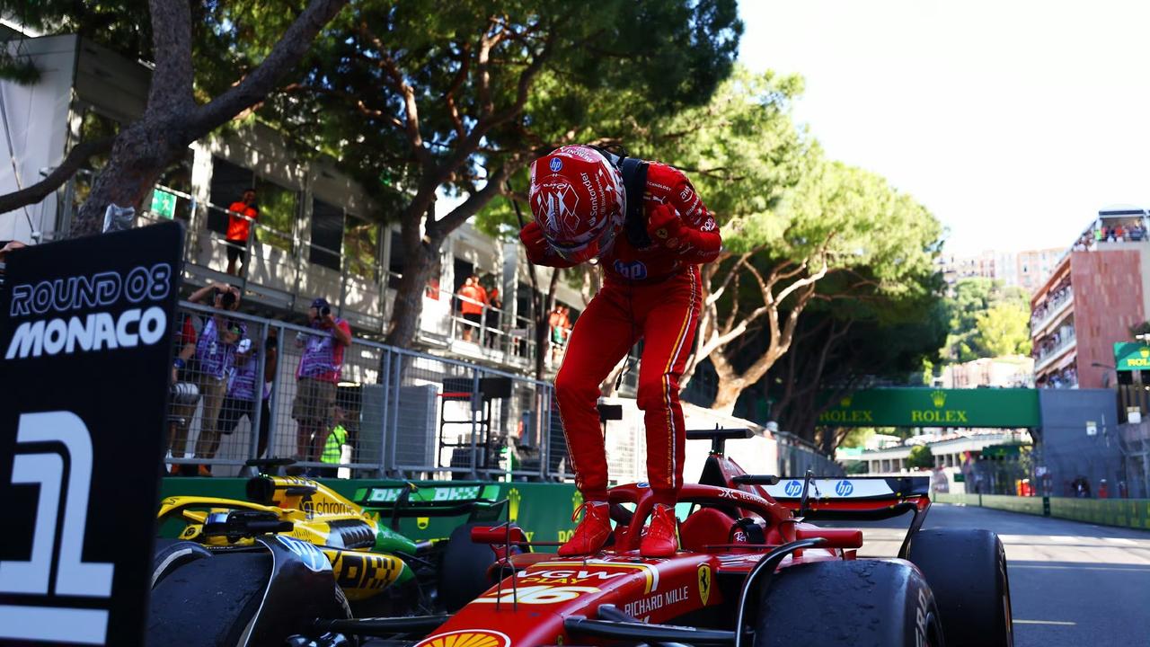 当勒克莱尔的红色赛车冲过蒙特卡洛赛道的终点线,当格子旗在他头顶挥舞的那一刻,这哪