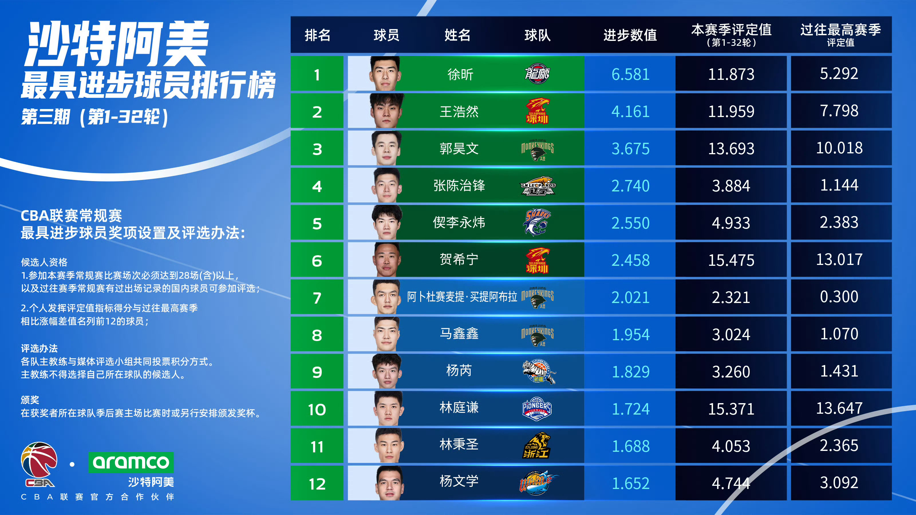 徐昕拿到这赛季的最具进步球员应该悬念不大,不过上榜的几位这赛季都很优秀了。cba