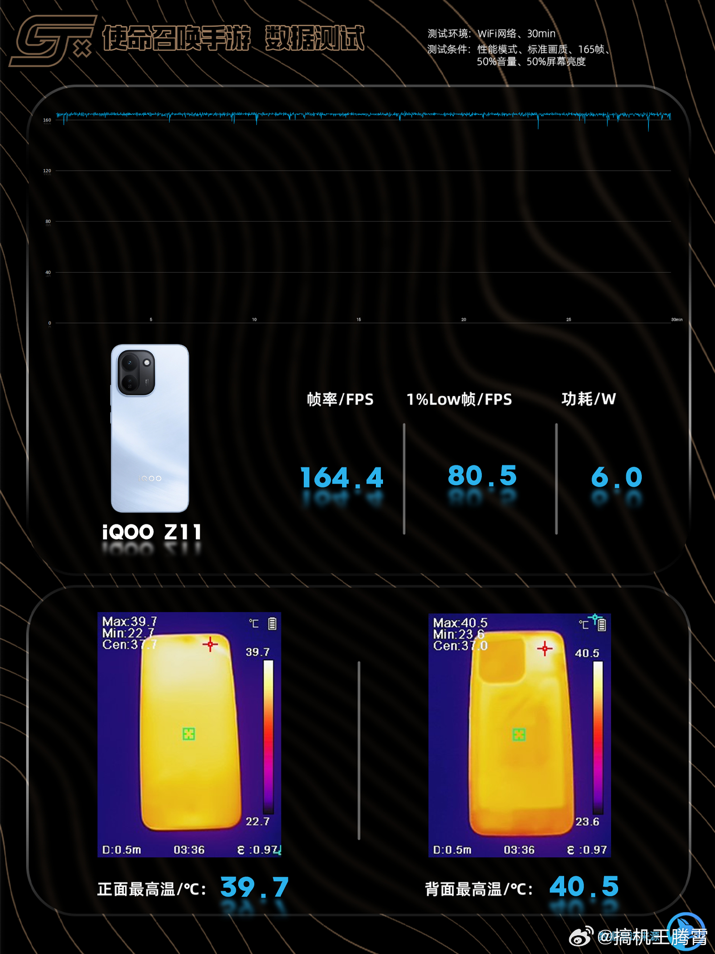 因为这块屏幕支持165Hz高刷,所以能够可以体验到原生165帧的游戏体验,《使命召唤》165帧 + 标准画质,半小时平均164.4帧、功耗6W,温控还不错,最高只有40.5℃。