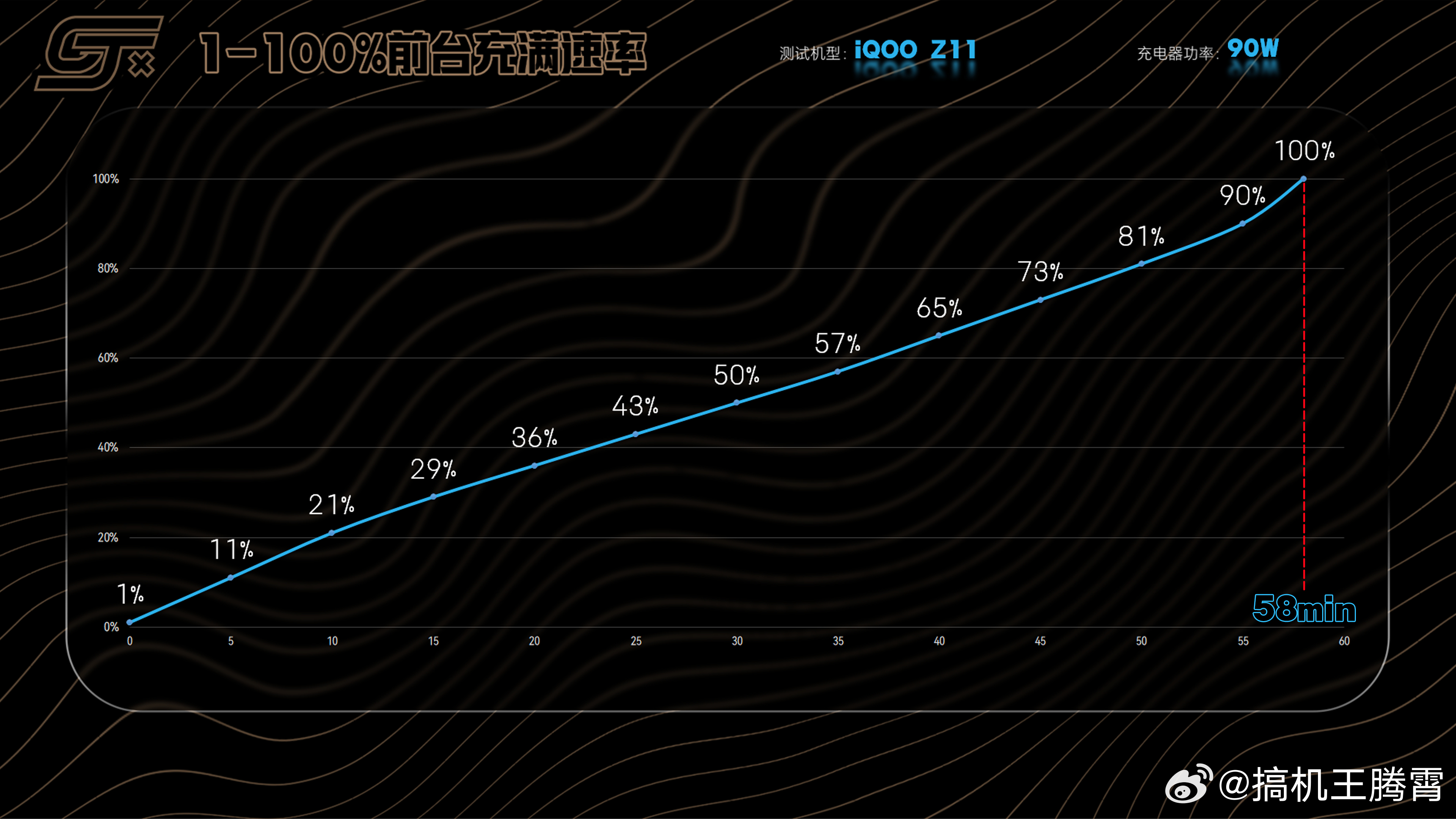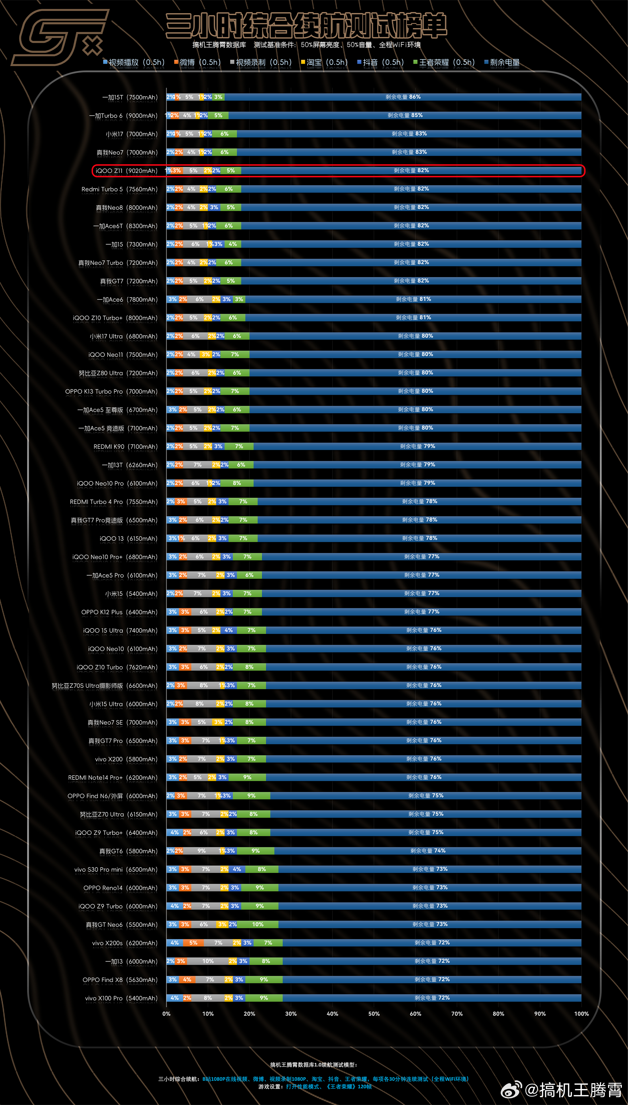 9020mAh的电池续航不错,三小时综合续航测下来剩82%的电量,榜单排名第五。90W闪充的充电速度也还可以,半小时可以充50%,前台充满总耗时58分钟,这表现如何