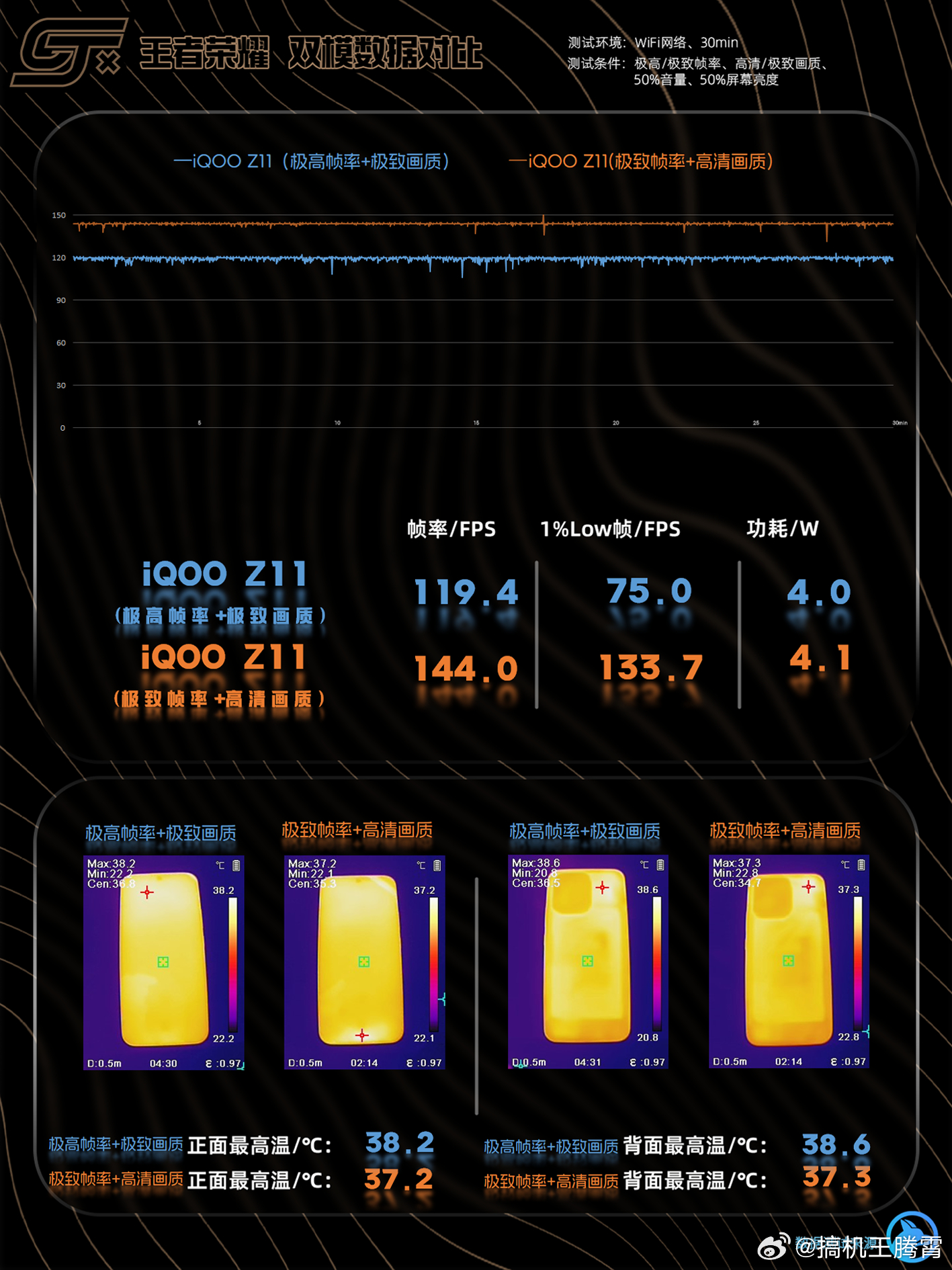 室温25℃左右,通过PerfDog实测,《王者荣耀》极高帧率 + 极致画质双开,半小时平均119.4帧,功耗4W、最高温在背面38.6℃;同样支持极致帧率,不过只能极致帧率 + 高清画质双开,半小时平均144帧,功耗4.1W、最高温在背面37.3℃,温度还更低了。