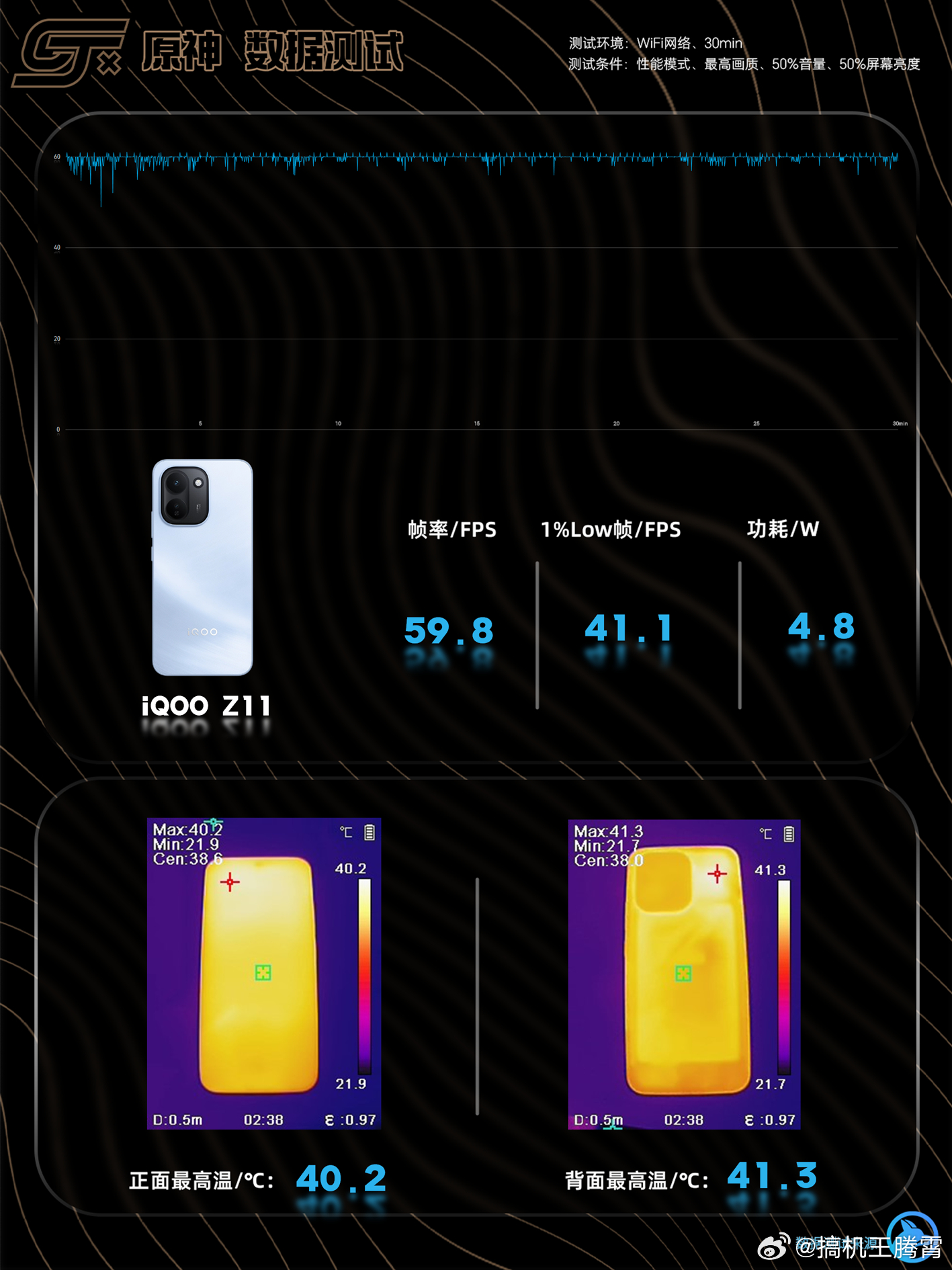 半小时《原神》一路跑图 + 打怪,半小时平均59.8帧、功耗4.8W、最高温41.3℃,基本上可以跑满,压力不算大,只是功耗略高了点。