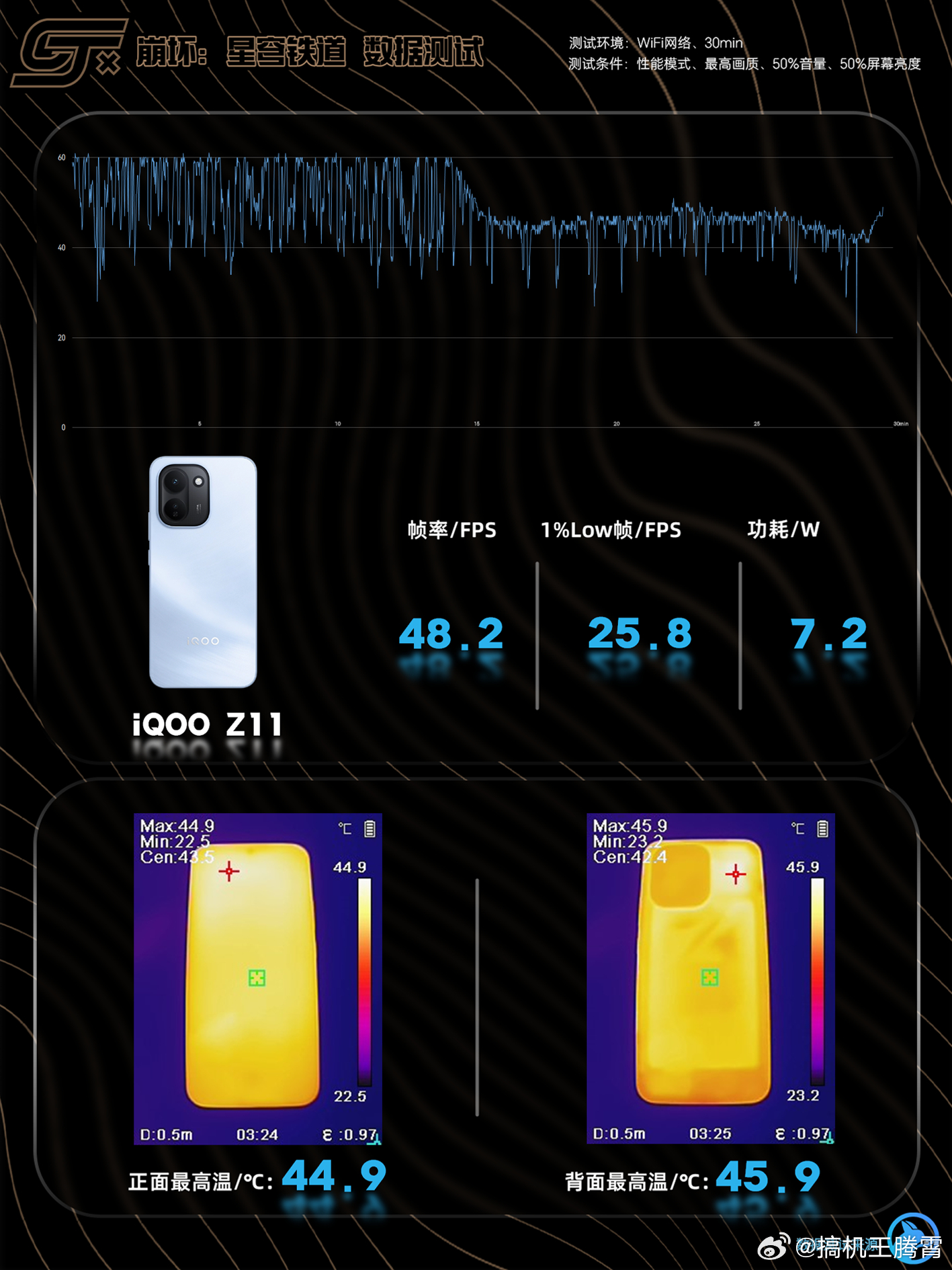 重载《崩坏:星穹铁道》黄金的时刻冲刺跑图压力就上来了,半小时平均48.2帧,前15分钟虽然有帧率波动但没锁帧,15分钟后锁到了45帧左右,但能感觉到帧率跳动好不少,功耗7.2W有些偏高,最高温45.9℃,如果平时不玩特别重载的手游,那这颗天玑8500满血版还是可以胜任的。