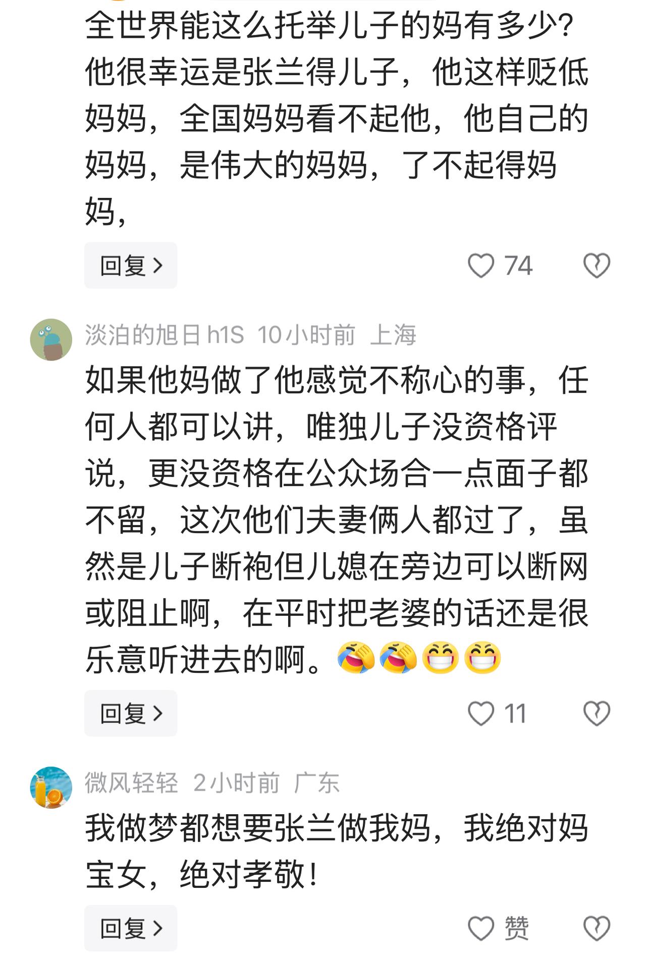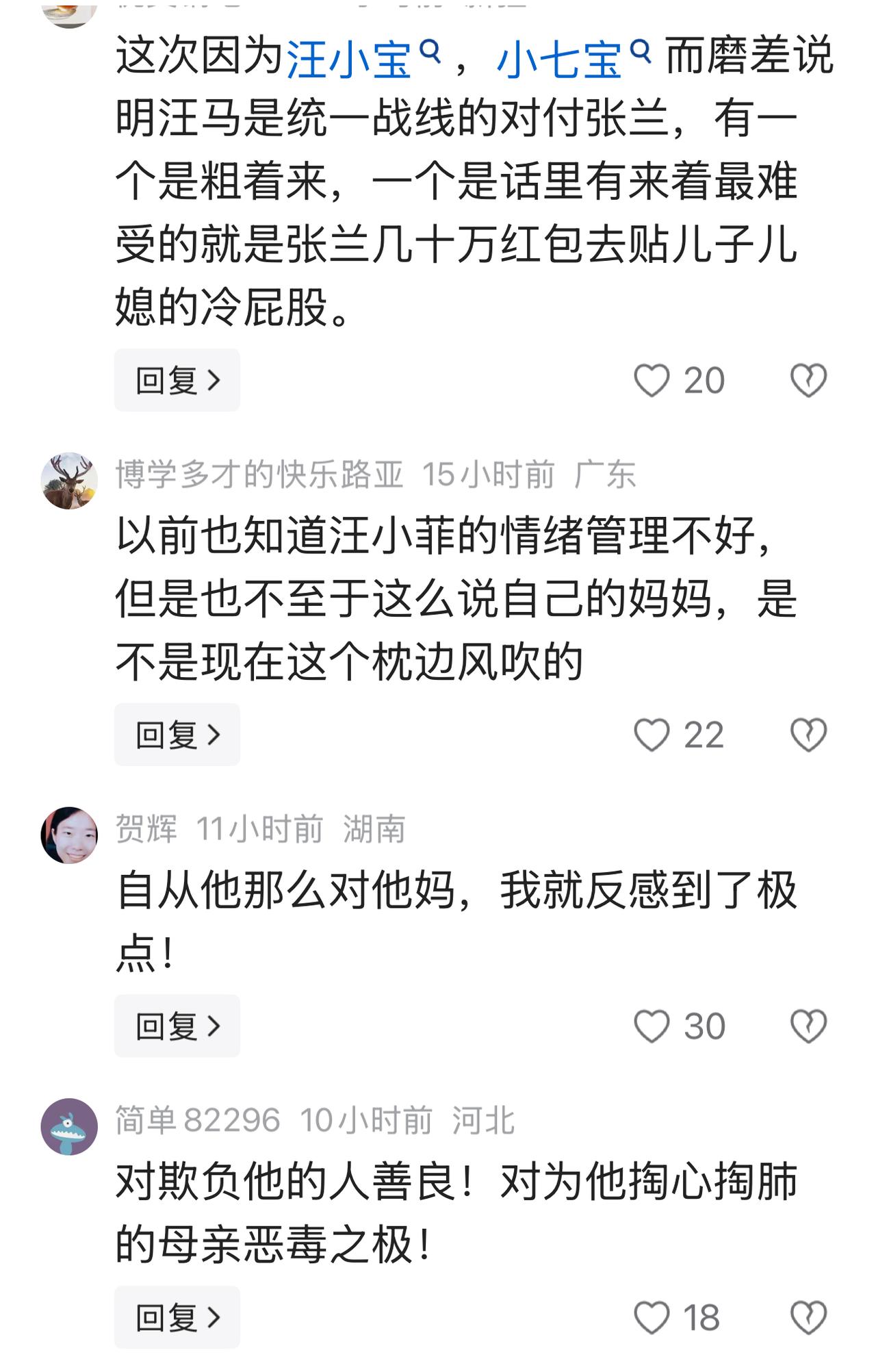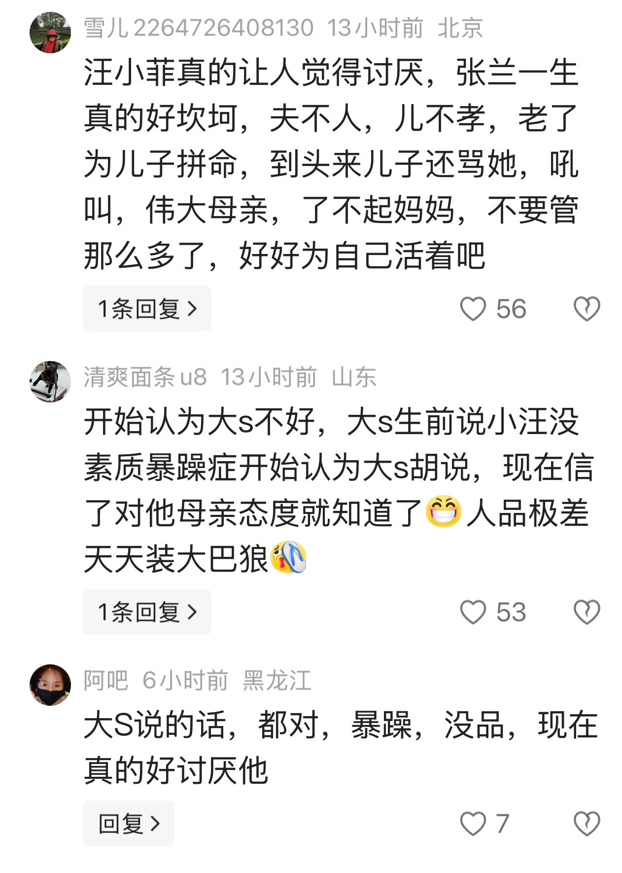 他很幸运是张兰得儿子,他这样贬低妈妈,全国妈妈看不起他,他自己的妈妈,是伟大的妈妈,了不起得妈妈。""汪小菲真的让人觉得讨厌,张兰一生真的好坎坷,夫不人,儿不孝,老了为儿子拼命,到头来儿子还骂她,吼叫,伟大母亲,了不起妈妈。"看看网友的评论真的感同身受。