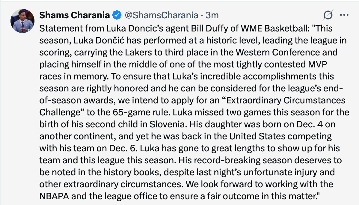 湖人站得住脚的理由是东契奇因为孩子出生而错过两场比赛。按规则,如果他打了这两场,他将是66出场,超过65,而孩子出生缺席是不可抗力,属于可以进行争辩的特例。因此湖人可以以此为理由提交申请,使东契奇重新获得评奖资格。