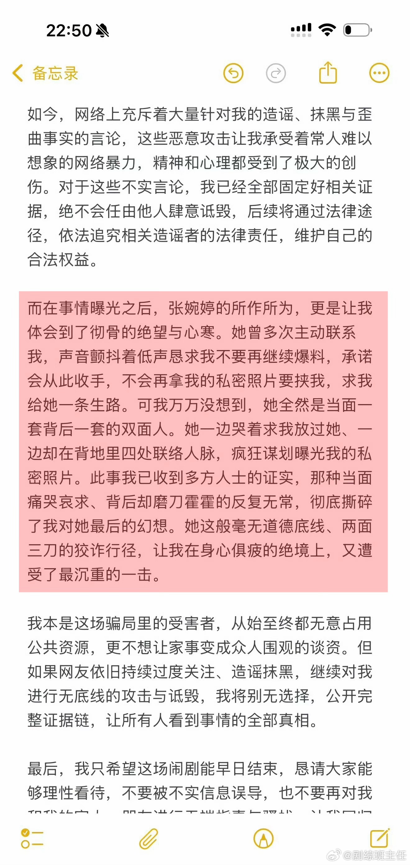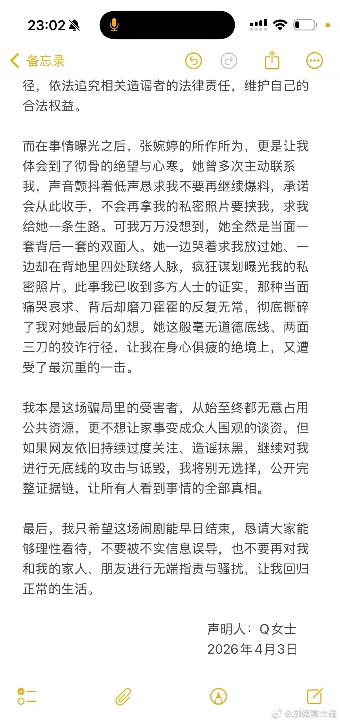 曝张婉婷想曝光Q女士的私密照Q女士声明里说到张婉婷想曝光她的私密照,并对她进行言语攻击恶意谩骂…
