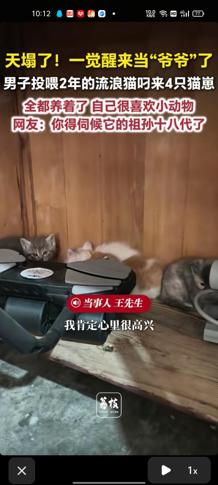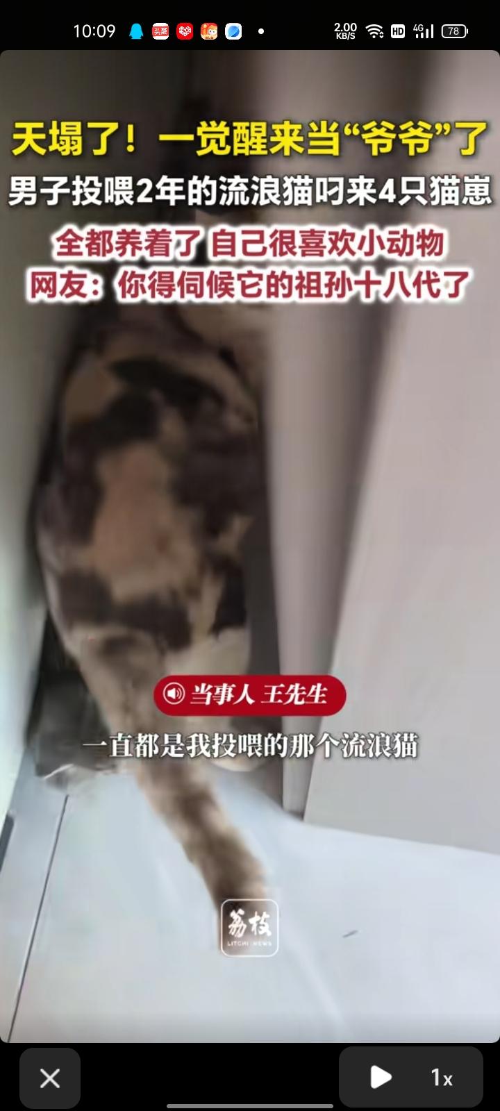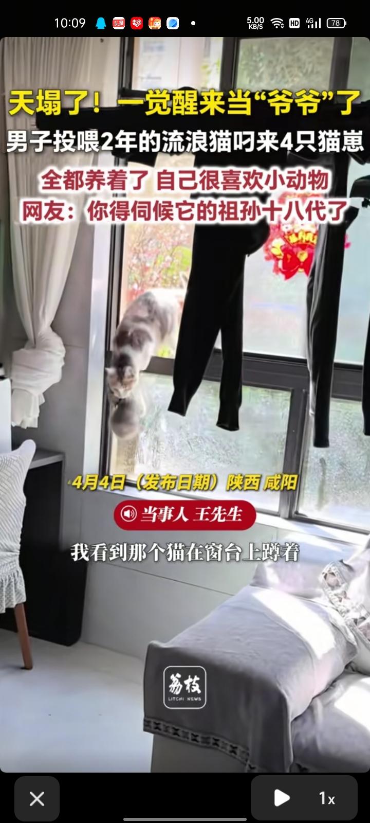 3月31日,咸阳市礼泉县。王先生称,自己看到一只猫在窗台上蹲着,叼着一只猫崽掉地上,一直是自己投喂的那个流浪猫。自家是一楼,窗户外边有绿化带,把猫粮放在窗台上给它喂了两年。四只猫崽全都养着了,自己很喜欢小动物