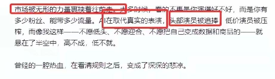 入行三年,她曾主演《步步深陷》《皇后娘娘带球跑路》等多部热门短剧,却坦言行业早已变味。长文中痛斥市场重流量轻演技,演员被当成商品压榨,AI技术更是不断取代真实表演,头部艺人受追捧,底层演员生存艰难。