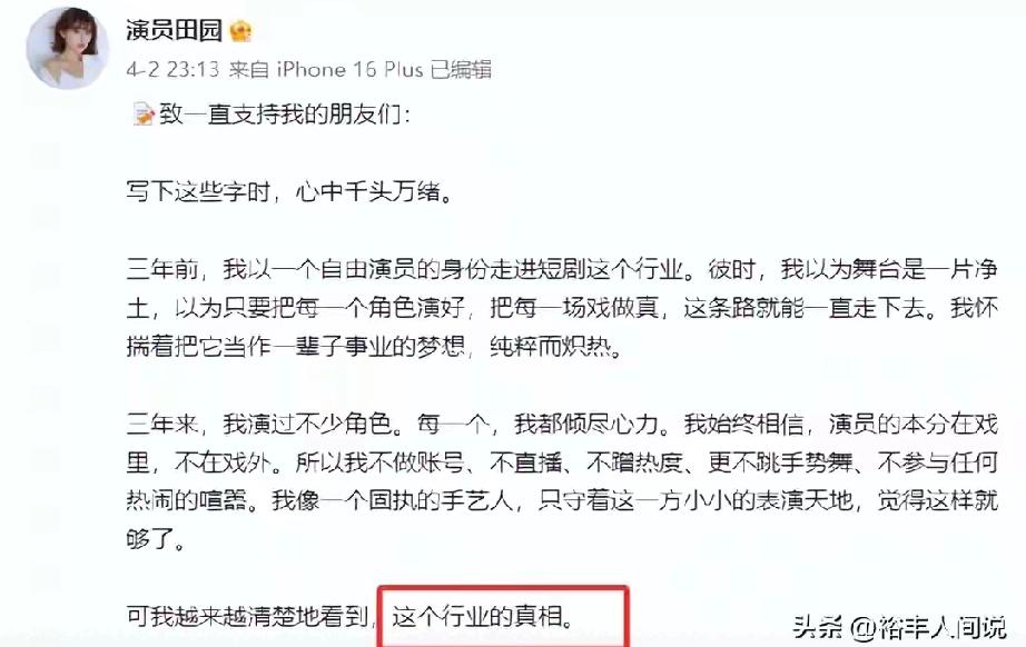 26岁短剧演员李田园宣布退圈!发长文曝行业内幕,多位演员发声共鸣4月3日,26岁短剧女演员李田园正式发长文宣布退圈,引发行业热议。