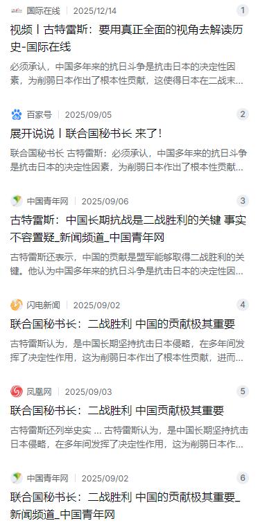 古特雷斯说得特别实在。他说,有一种观点认为二战是从1939年开始、1945年结束的,但这不是全部事实。事实是,日本对中国的大规模入侵,才是二战真正的开端。这话可不是随便说说的,古特雷斯是联合国最高行政首长,他接受的是央视的官方专访,这个份量有多重,大家心里都有数。他还说了一段让人心头一震的话:必须承认,中国多年来的抗日斗争是抗击日本的决定性因素,为削弱日本作出了根本性贡献,这才使得日本在二战末期最终被击败。而且他特意强调,我说的都是事实,不是为了取悦谁,历史就该这么看。