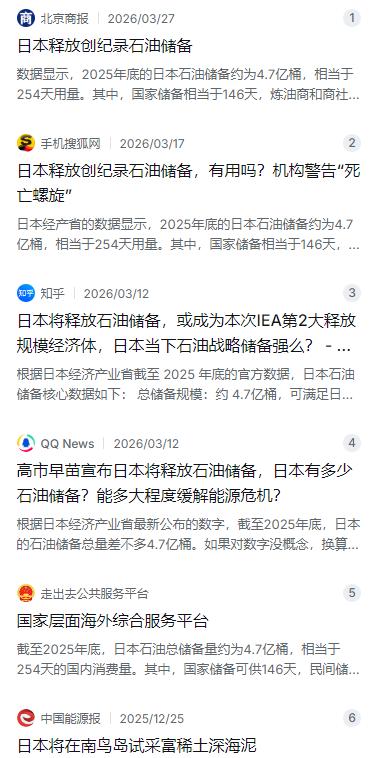先说能源这事儿。大家知道日本现在有多少石油储备吗?根据日本经济产业省2025年底的官方数据,这个数已经到了4.7亿桶,什么概念?够日本全国用254天,将近九个月。这里面国家的储备有146天,各个炼油厂和商社手里的民间储备还有101天,再加上跟产油国合作在日本境内存着的共同储备7天,加一块就是254天。国际能源署规定的标准是多少?90天。日本直接超了两倍多,愣是给自己攒了将近一年的家底。说白了,就算霍尔木兹海峡真出了大事,所有从中东来的油轮都停了,日本人照样能安安稳稳过将近一年,一点不慌。