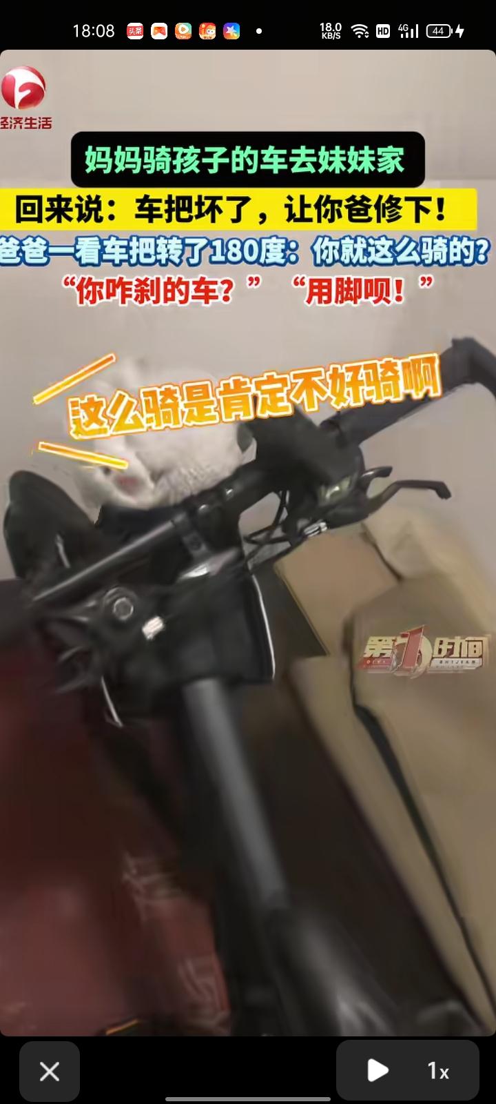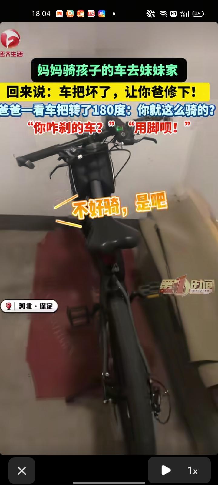 4月1日,保定市易县。王先生分享一段视频,前两天老婆骑孩子的车去她妹妹家,回来时就说自行车车把可能坏了,两边有个护手超厚不好骑,跟孩子说“让你爸修下”。自己一看,车把转了180度。随后,问老婆是怎么刹的车,她表示用脚往地上蹭。