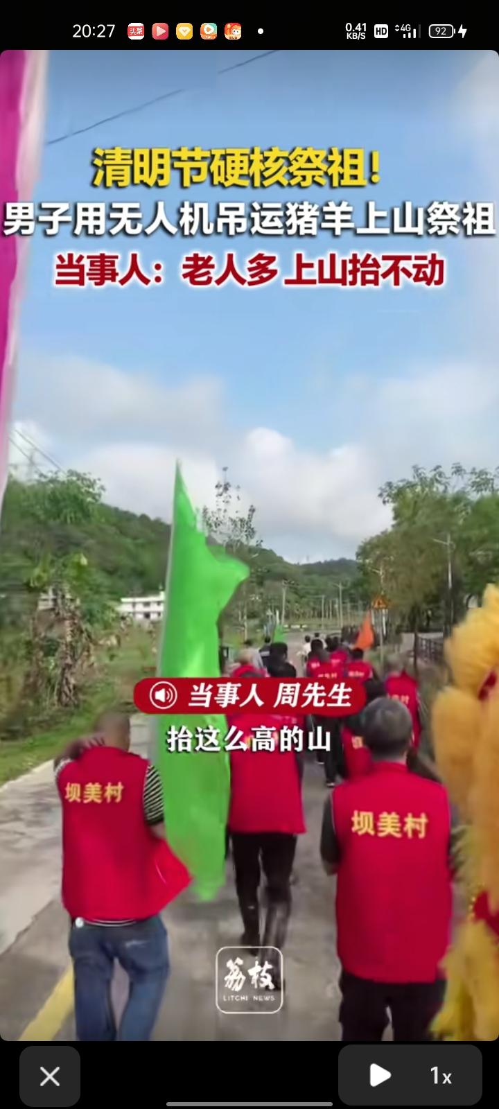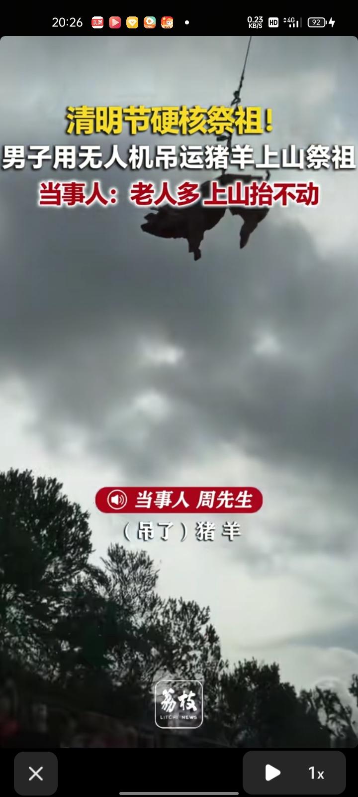 4月4日,梅州市五华县。清明节出现硬核祭祖,男子用无人机吊运猪羊上山祭祖,飞了大概两公里。