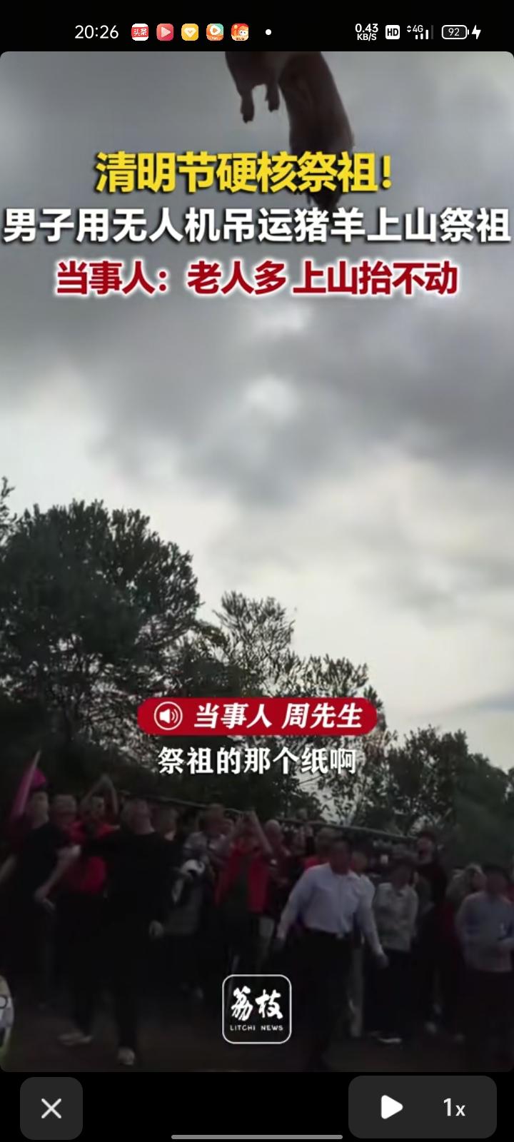 4月4日,梅州市五华县。清明节出现硬核祭祖,男子用无人机吊运猪羊上山祭祖,飞了大