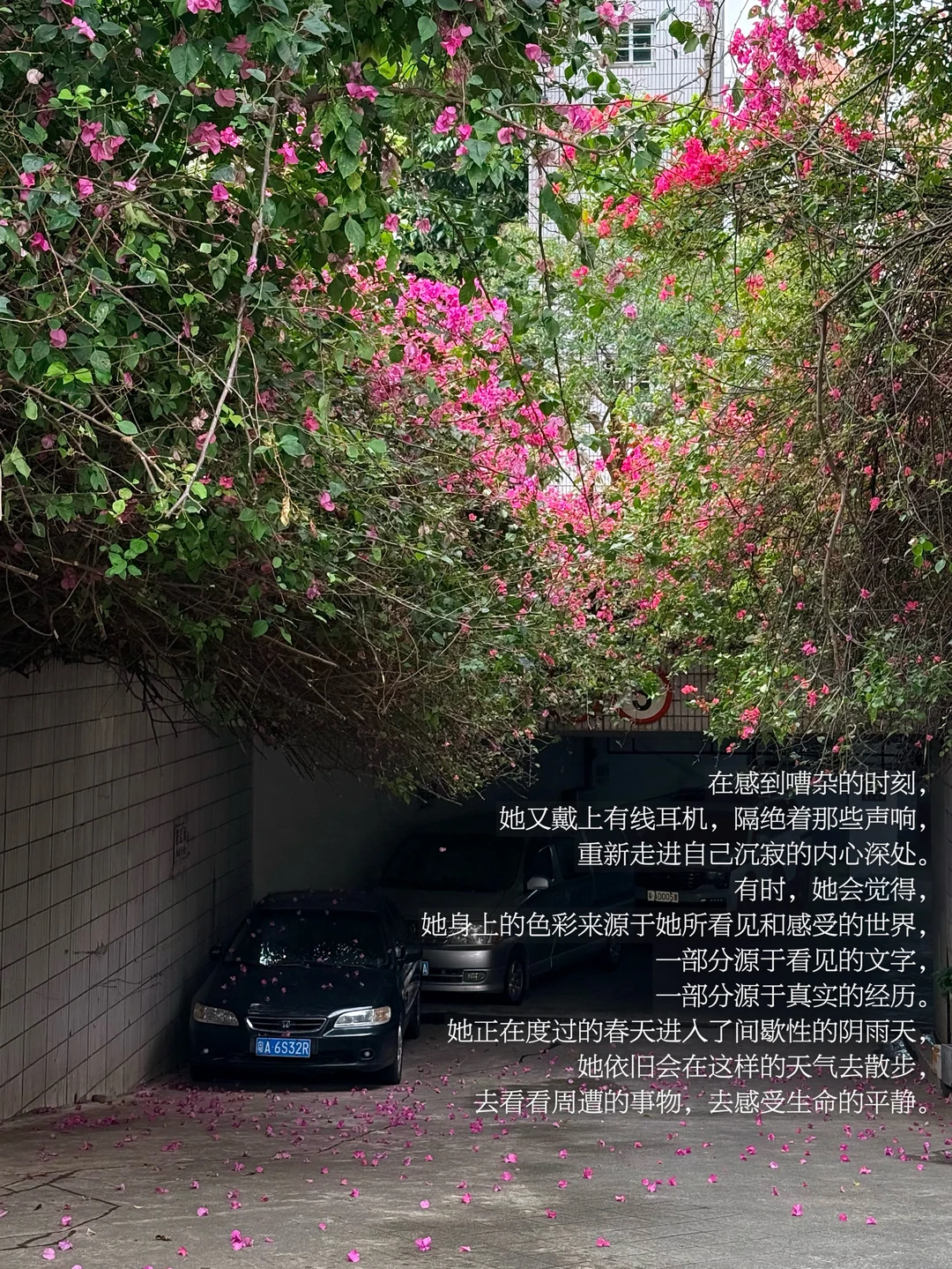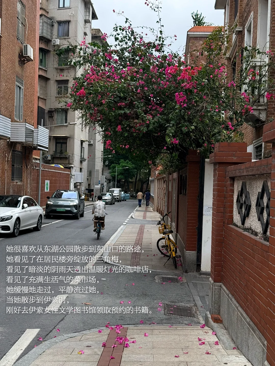 她很喜欢从东湖公园散步到东山口的路途,她看见了在居民楼旁绽放的三角梅,看见了暗淡的阴雨天透出温暖灯光的咖啡店,看见了充满生活气的菜市场,当她散步到伊索时,刚好去伊索领取预约的书籍。
