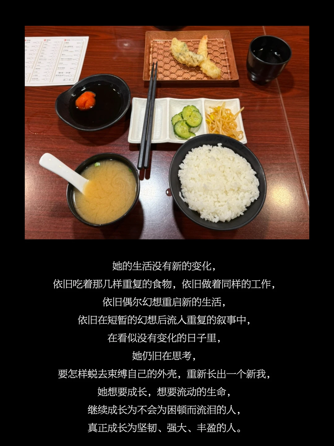 她的生活没有新的变化,依旧吃着那几样重复的食物,依旧做着同样的工作,依旧偶尔幻想重启新的生活,在看似没有变化的日子里,她仍旧在思考,要怎样蜕去束缚自己的外壳,重新长出一个新我,她想要成长,想要流动的生命,继续成长为不会为困顿而流泪的人,真正成长为坚韧、强大、丰盈的人。
