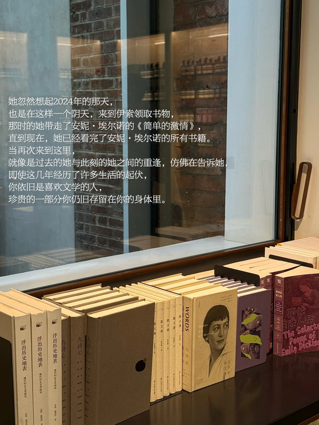 她忽然想起2024年那天,也是在这样一个阴天来到这里,那时的她带走了安妮·埃尔诺的《简单的激情》,直到现在,她已经看完了安妮·埃尔诺的所有书籍。当再次来到这里,就像是过去的她与此刻的她之间的重逢仿佛在告诉她,即使这几年经历了许多生活的起伏,你依旧是喜欢文学的人,珍贵的一部分你仍旧存留在你的身体里。