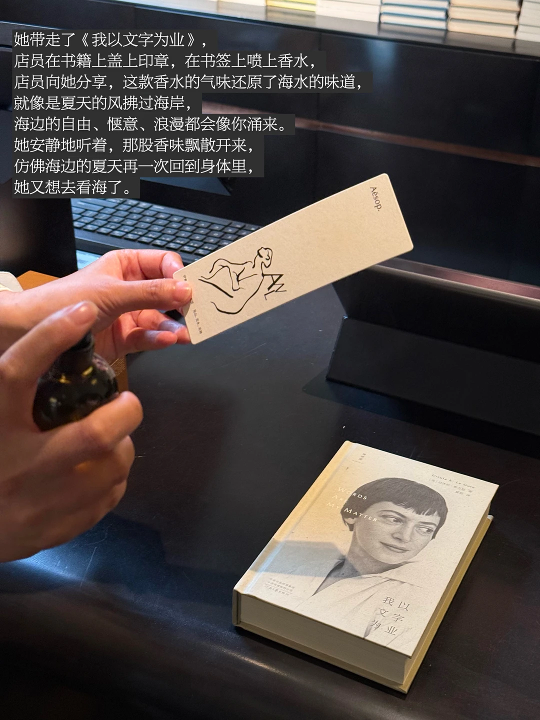 她带走了《我以文字为业》,店员在书籍上盖上印章,在书签上喷上香水,店员向她分享,这款香水的气味还原了海水的味道,就像是夏天的风拂过海岸,海边的自由、惬意、浪漫都会像你涌来。她安静地听着,那股香味飘散开来,仿佛海边的夏天再一次回到身体里,她又想去看海了。