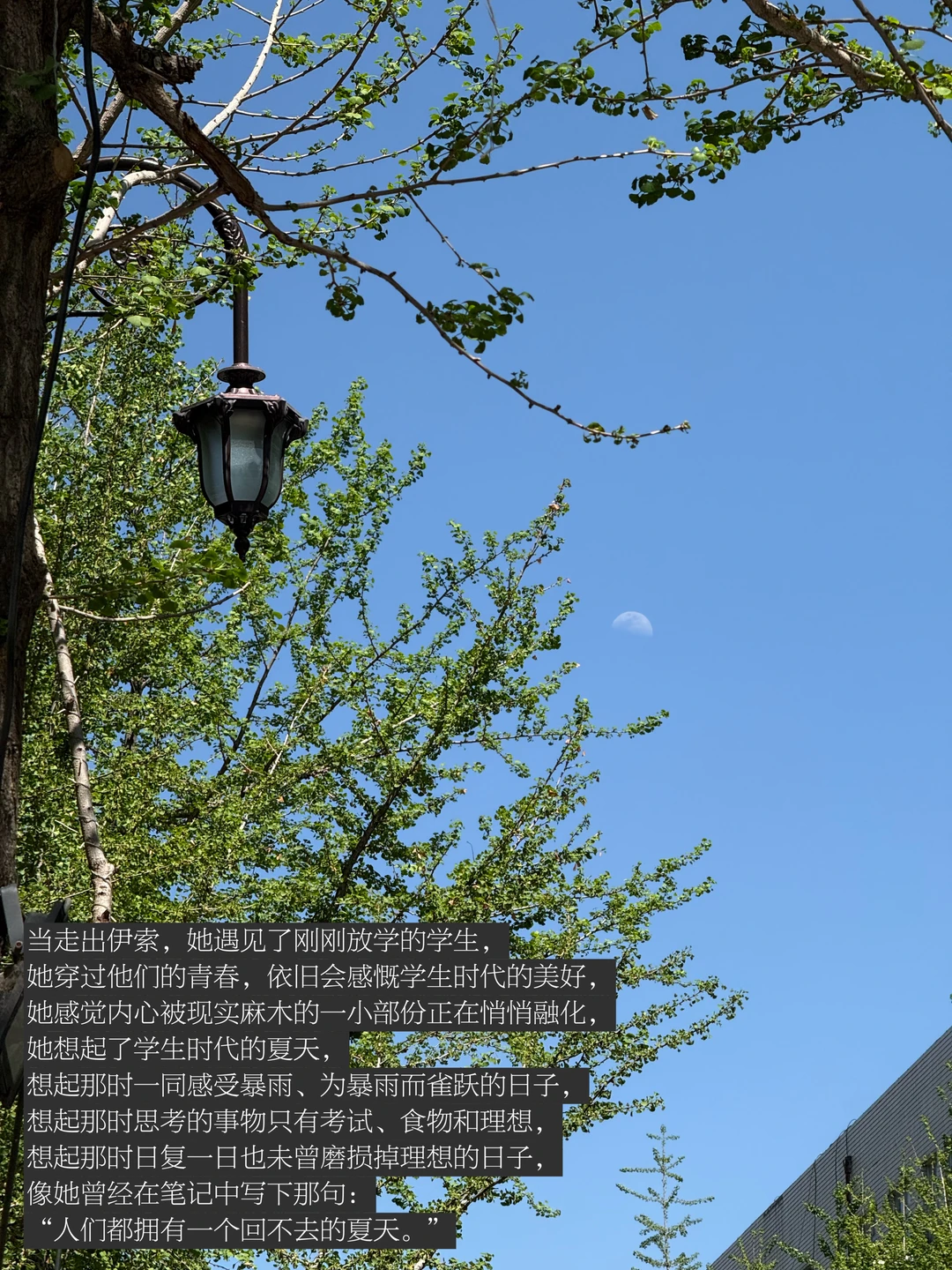 当走出伊索,她遇见了刚刚放学的学生,她穿过他们的青春,依旧会感慨学生时代的美好,她想起了学生时代的夏天,想起那时一同感受暴雨、为暴雨而雀跃的日子,想起那时思考的事物只有考试、食物和理想,想起那时日复一日也未曾磨损掉理想的日子。