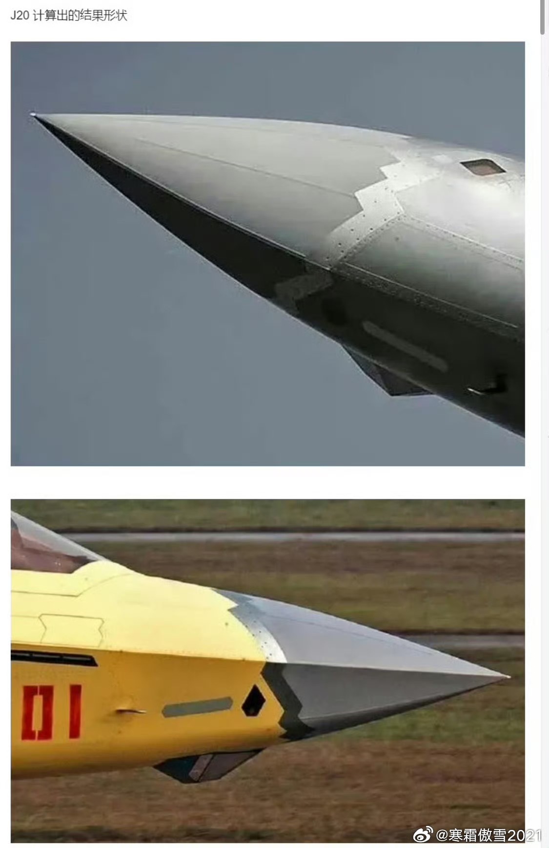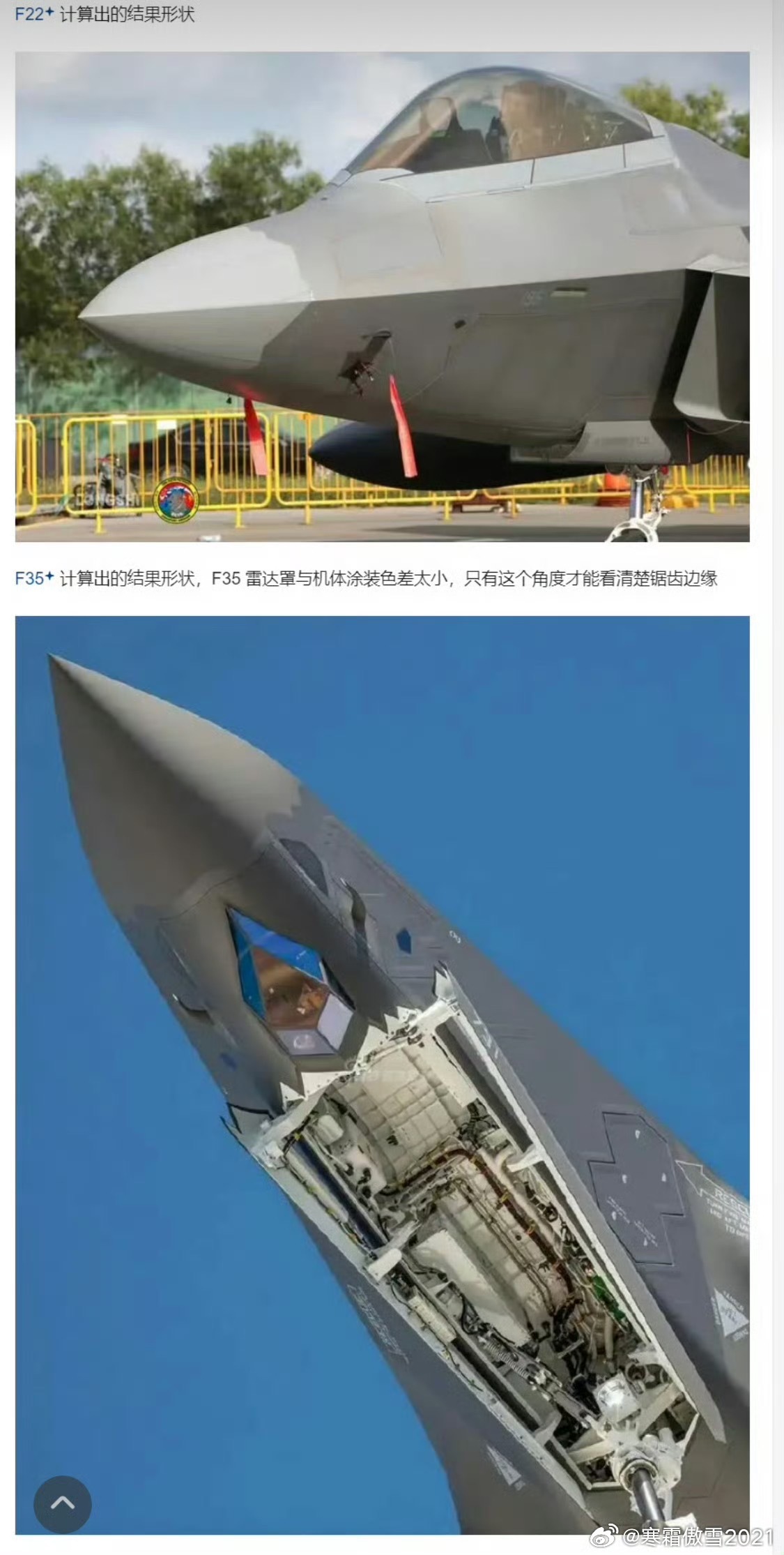 全球武器装备盘点烽火问鼎计划军事ai新视野 关于苏57雷达罩锯齿压痕与其他五代机锯齿雷达罩的区别(图11和图12为AI生成图)➡️有人拿图1证明苏57雷达罩有锯齿压痕佐证苏57雷达罩有RCS缩减措施,其实图2的米格35和图3的米格29KUB雷达罩都有锯齿压痕。⭐️有RCS缩减措施不等于隐形达到五代机的锯齿雷达罩水准。例如你总不能因为J10枭龙用了DSI就认为它们是五代机吧?➡️一个最简单的事实是雷达罩一般为复合材料与金属机身介质不同。复合材料蒙皮与金属机身采用无锯齿(直缝/平缝)连接,会显著增大电磁波散射、抬升RCS,是隐身设计的强散射源。图4~图6够近够高清了,足以佐证苏57透波雷达罩与金属机身是直缝垂直水平面连接。即便你雷达罩前半部分有锯齿压痕调整电磁波散射方向、你锯齿压痕后面的雷达罩部分仍然与机身直缝相连产生强散射。雷达罩又称天线舱是战斗机三大强散射源之一。➡️图7~图9,其他五代机透波罩整体与金属机身锯齿连接,有效抑制了全部透波罩异种材料产生的强散射。➡️米格-29家族的基础气动与机身设计诞生于上世纪70年代,完全没有隐身作战的顶层规划。米格-29K的雷达罩锯齿,是后期改进型号追加的次要优化项,核心目的是在不改动机身基础框架、不显著增加成本的前提下,尽可能削弱雷达罩与机身接缝这个强反射源,小幅缩短敌方雷达的探测距离。它的设计优先级为:雷达透波性能>结构强度与维护性>有限的RCS减缩。➡️五代机的雷达罩锯齿,是战机立项之初就纳入全机隐身顶层设计的核心环节,与机身棱边、进气道唇口、弹舱边缘、尾喷口锯齿做了一体化的电磁仿真设计。它严格遵循隐身设计的平行法则:全机所有锯齿、棱边的倾斜角度完全统一,将所有边缘的反射波集中到少数极窄的、非威胁方向的波瓣内,让敌方雷达几乎无法接收到有效回波。五代机雷达罩的设计优先级为:隐身性能>雷达性能适配>结构与维护性,隐身是第一核心指标,所有结构设计都为隐身需求让步。⭐️结论:很明显苏57用米格29的锯齿压痕雷达罩是为了降低制造成本,也不愿意把隐形放在高优先级位置。 苏57的无锯齿直缝是强散射源,隐身设计必须用机身与雷达罩接缝锯齿化+导电密封+FSS雷达罩材料阻抗匹配来抑制散射。以上三项苏57均没做到。苏57采用米格29雷达罩技术可能的因素还有它雷达罩维护侧开必须保持侧面直缝,维护简便性指标排在了隐形前面(图12)、图13~图15苏57和苏75的早期涂装雷达罩锯齿都是油漆画出来的,说明苏霍伊肯定知道要锯齿缝连接、但出降低成本(例如加工精度)、维护简便性、隐形权重靠后三大因素影响下,形成了现存直接挪用米格29KUB雷达罩的设计。