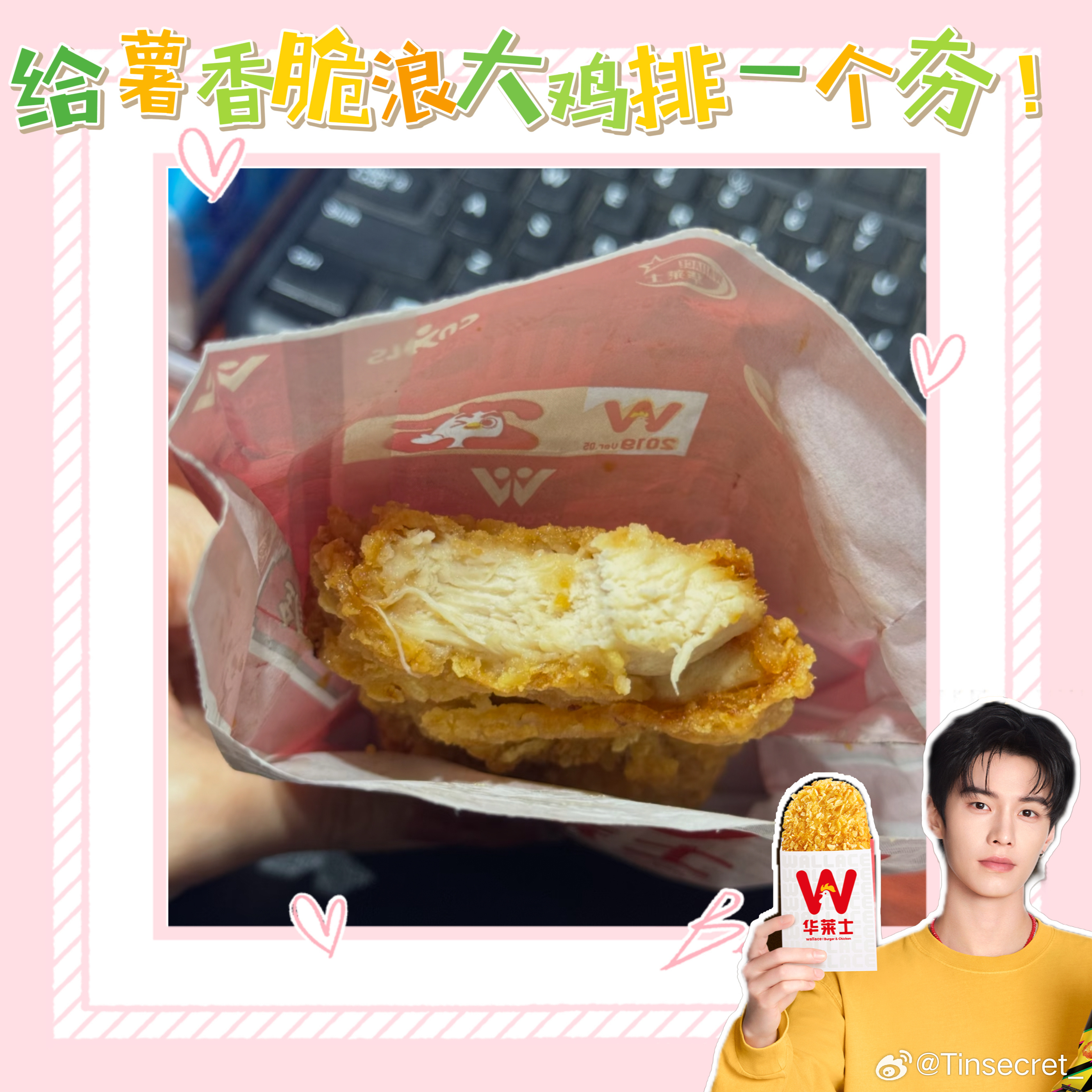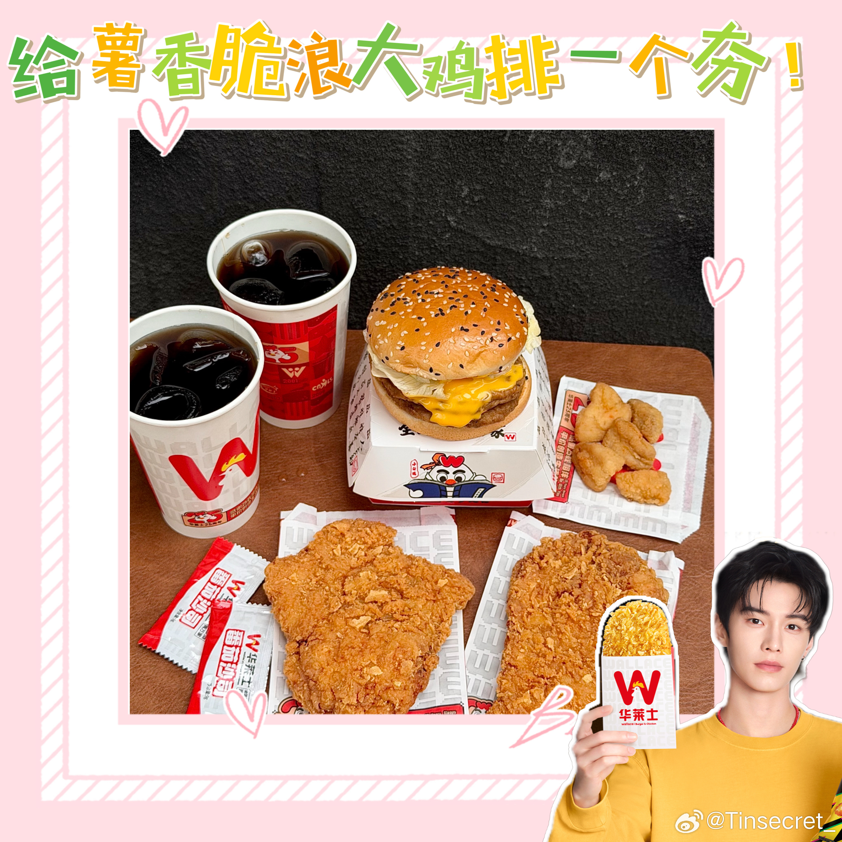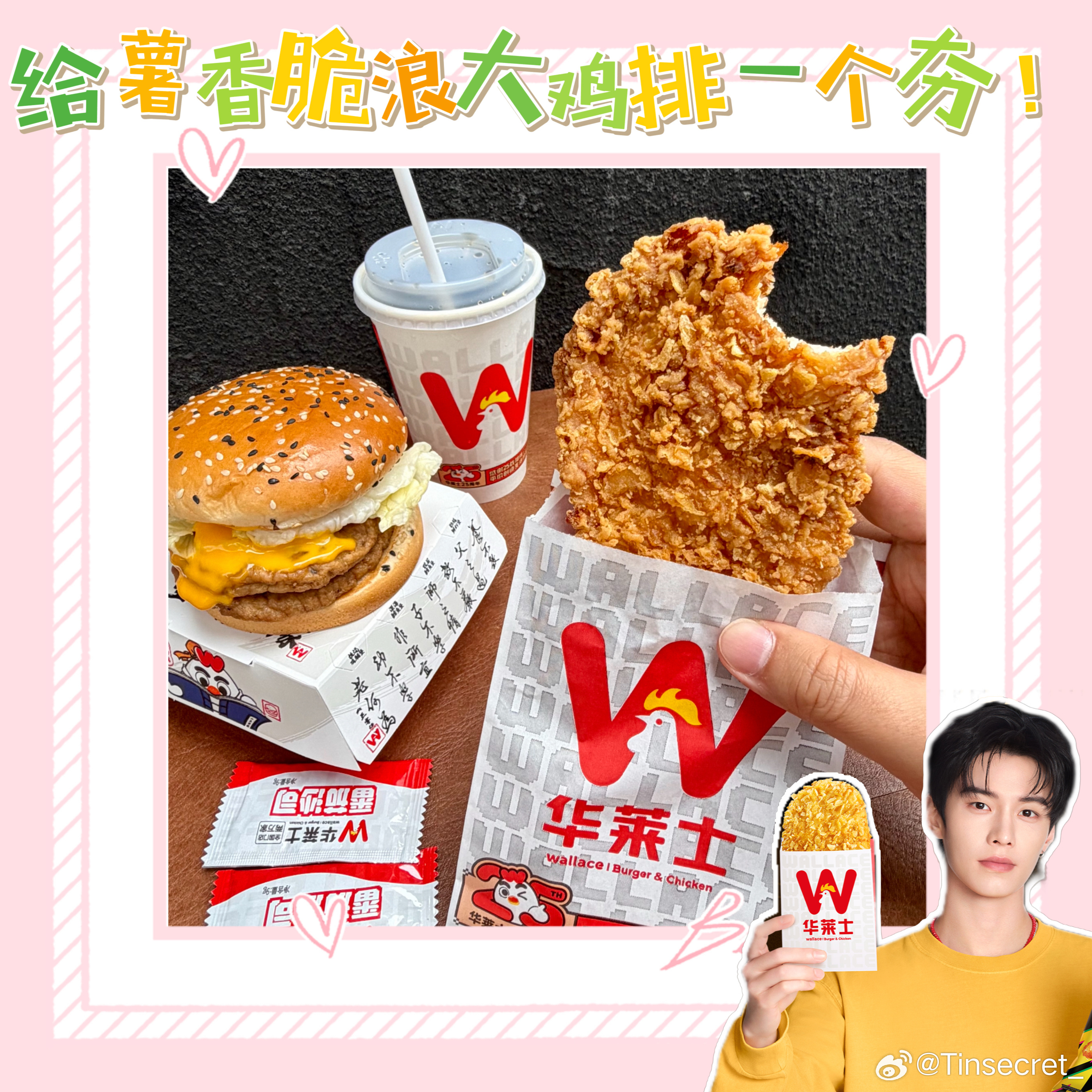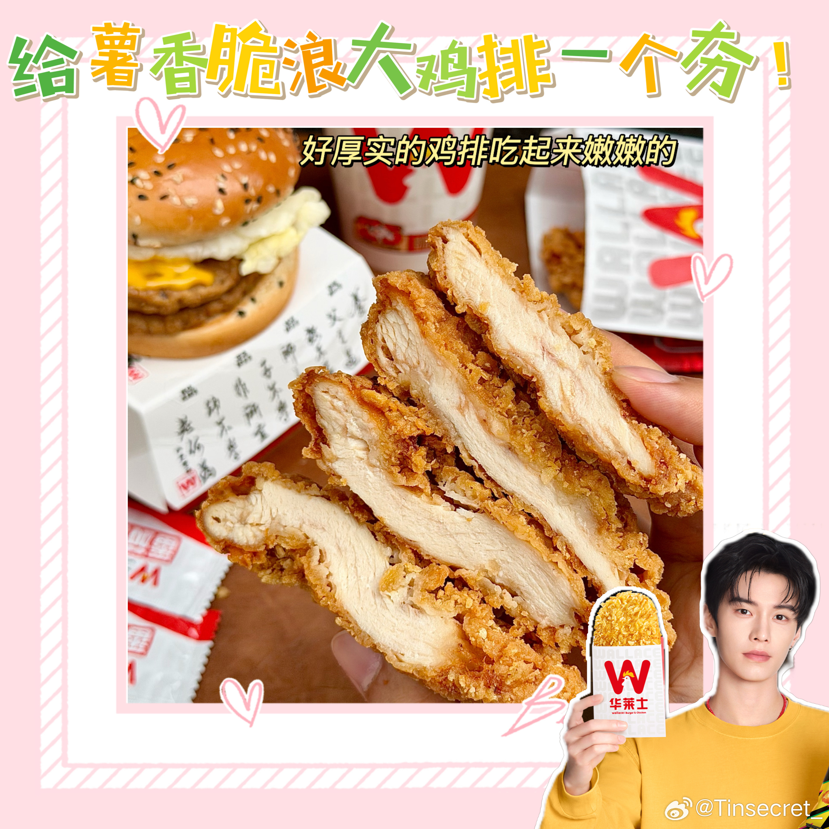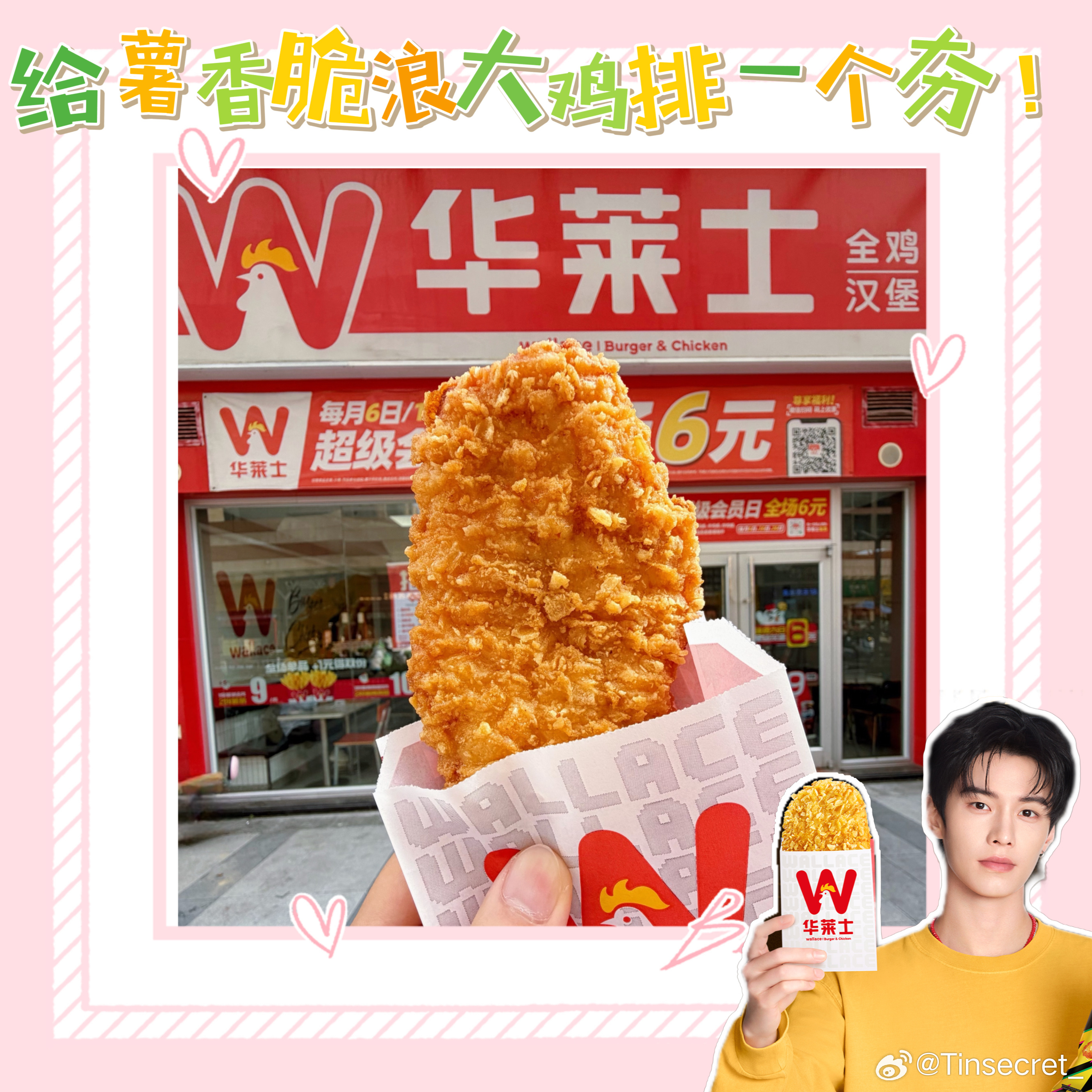 华莱士这次联名直接拿捏了“吃货+追星党”的双重快乐😋!美味、颜值、周边、福利全在线,鸡排党们别犹豫了,快去华莱士喊一句:给我来一份薯香脆浪大鸡排! 吃完你会回来谢我的💥