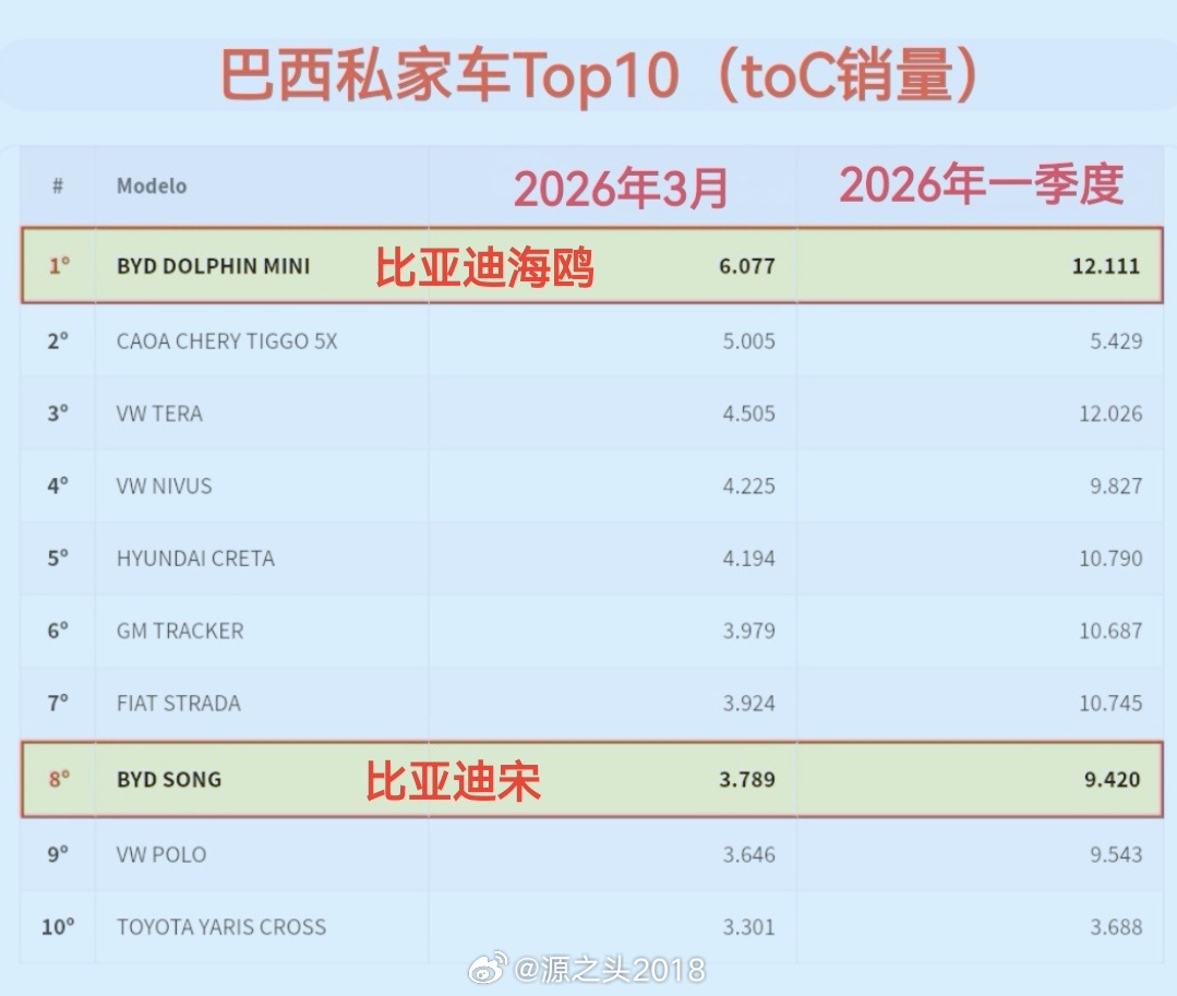 2026年3月,比亚迪汽车在巴西创造多个新纪录:- 月销16406台(乘用车+皮卡),历史新高(不含腾势)- 海鸥登顶巴西私家车(toC)销冠(2月&3月&一季度)